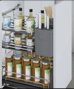 - Kệ gia vị dụng cụ ray giảm chấn (K5SPTJ030)– Với thiết kế hiện đại cùng chất liệu inox cao cấp, sản phẩm này có khả năng chịu được môi trường đựng chai lọ mắm muối hoặc chai lọ gia vị. Điều này giúp bảo vệ phụ kiện trong tủ bếp của bạn, tạo nên vẻ sáng bóng và sang trọng, đồng thời dễ dàng vệ sinh và lau chùi. Thiết kế kệ gia vị dụng cụ 400mm có thể chứa được chai dầu ăn 5 lít và một số dụng cụ nấu nướng như dao, thớt, hũ gia vị…