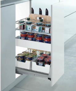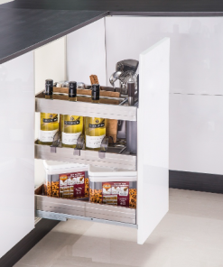 - Kệ gia vị dụng cụ inox bản (3014001) – Thiết kế hợp lý với 3 tầng, sản phẩm này gần như đủ chỗ để chứa các phụ kiện nhà bếp. Với việc tích hợp ray trượt âm chất lượng cao cấp, sản phẩm đóng mở nhẹ nhàng và êm ái, giúp tăng tuổi thọ của tủ bếp. Sản phẩm này thích hợp cho hệ khoảng tủ kệ gia vị với kích thước 400mm, tận dụng tối đa không gian trong một căn bếp hiện đại.