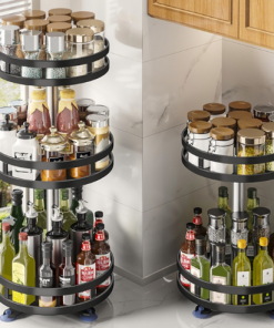 - Kệ gia vị xoay inox: Đây là một loại kệ đặc biệt có khả năng xoay 360 độ. Kệ gia vị xoay inox thường có nhiều ngăn hoặc tầng để đặt các gia vị, và khi cần sử dụng, bạn có thể xoay kệ để tìm và lấy gia vị một cách dễ dàng.