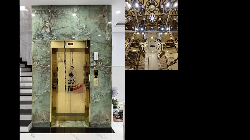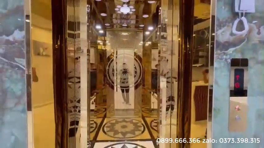 Toàn bộ không gian bên trong cabin được ốp inox gương vàng và inox gương vàng ăn mòn. Phần inox gương vàng có thể để dạng gương bóng hoặc tạo các họa tiết ăn mòn trang trí. Những hoa văn này được xử lý bằng công nghệ ăn mòn trên nền gương vàng nên nhìn rất tinh tế và nổi bật. Bình thường bề mặt tấm inox sẽ là gương vàng phẳng 100%, nhưng khi thêm các họa tiết ăn mòn thì sẽ tạo ra điểm nhấn rất đẹp. Các họa tiết ở vách sau và vách hông đều do đội ngũ FujiLift tư vấn để chủ nhà lựa chọn theo sở thích riêng. Mỗi khách hàng sẽ có gu thẩm mỹ khác nhau, có người thích gương vàng sang trọng, có người thích gương trắng hoặc inox ăn mòn họa tiết. Cũng có những khách hàng thích phong cách đơn giản hơn thì có thể sử dụng inox sọc nhuyễn hoặc inox gương trắng cơ bản, vẫn đảm bảo thang máy nhìn rộng rãi, sáng và đầy đủ tiện nghi khi sử dụng.
