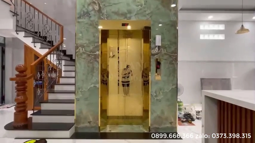 Đội ngũ FujiLift vừa hoàn thiện và bàn giao một mẫu thang máy gia đình tải trọng 400kg với 4 điểm dừng từ tầng 1 lên tầng 4. Mẫu thang này sử dụng inox gương vàng kết hợp inox gương vàng ăn mòn họa tiết, tạo nên vẻ đẹp sang trọng, nổi bật và hiện đại. Khi kết hợp cùng các loại đá ốp mà gia chủ đã lựa chọn trong ngôi nhà thì thang máy gần như trở thành điểm nhấn nổi bật nhất, giúp tôn lên giá trị thẩm mỹ của toàn bộ không gian sống. Thực tế, khi lắp đặt thang máy gia đình, giá trị tổng thể của ngôi nhà cũng được nâng lên rất nhiều nhờ sự tiện nghi và hiện đại mà nó mang lại. Khi chúng ta nhấn nút gọi tầng, cabin dừng đúng tầng thì cửa cabin sẽ mở đồng thời với cửa tầng, giúp việc di chuyển trở nên thuận tiện và an toàn.