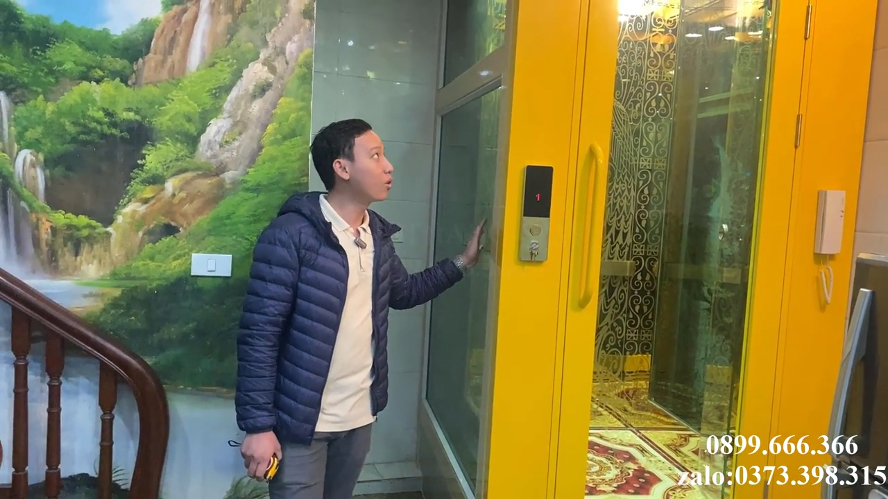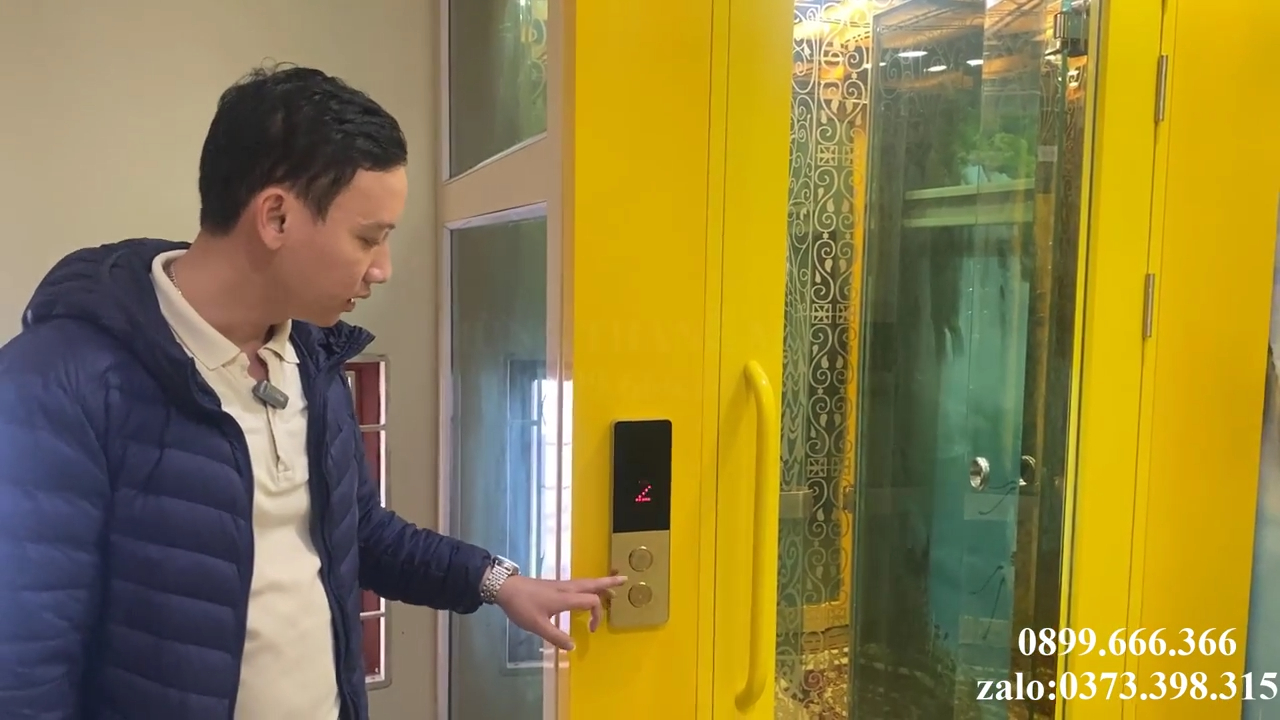 Khi di chuyển lên các tầng trên, chúng ta có thể thấy cabin được thiết kế với nhiều tùy chọn vật liệu như inox gương vàng, inox gương trắng hoặc inox xước tùy theo sở thích của gia chủ nhằm tạo hiệu ứng thẩm mỹ đẹp mắt, trần cabin có hệ thống đèn chiếu sáng ở bốn góc giúp không gian bên trong luôn sáng và sang trọng, trong công trình này phần mặt hông của khu vực thang còn được trang trí bằng tranh dán tường tạo nên điểm nhấn rất đẹp khi nhìn từ bên ngoài qua lớp kính cường lực trong suốt.