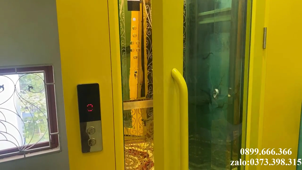 Về tổng quan sơ bộ thì quý vị có thể thấy phần bên ngoài thang được sử dụng tôn sơn tĩnh điện màu vàng nổi bật kết hợp với hệ cửa tự động hoàn toàn, khi chúng ta nhấn nút gọi thang thì toàn bộ quá trình đóng mở cửa và di chuyển của thang đều được thực hiện tự động rất tiện lợi và an toàn trong quá trình sử dụng, xung quanh thang máy sử dụng khung thép sơn tĩnh điện kết hợp kính cường lực giúp không gian nhìn thông thoáng và hiện đại hơn, toàn bộ phần khung được sơn đồng bộ màu trắng kết hợp với mặt trước bằng thép sơn tĩnh điện và màu sắc hoàn toàn có thể lựa chọn theo nhu cầu, trong công trình này chủ nhà lựa chọn màu vàng để tạo điểm nhấn nổi bật cho khu vực thang máy trong nhà.