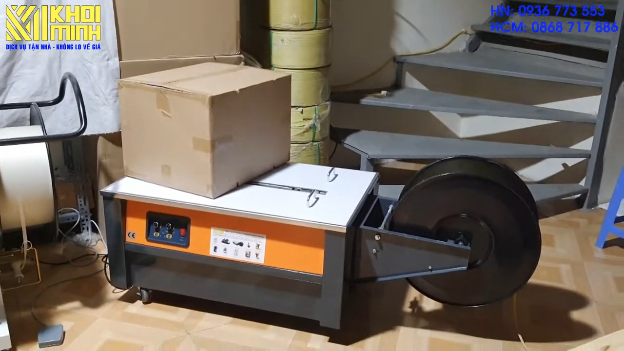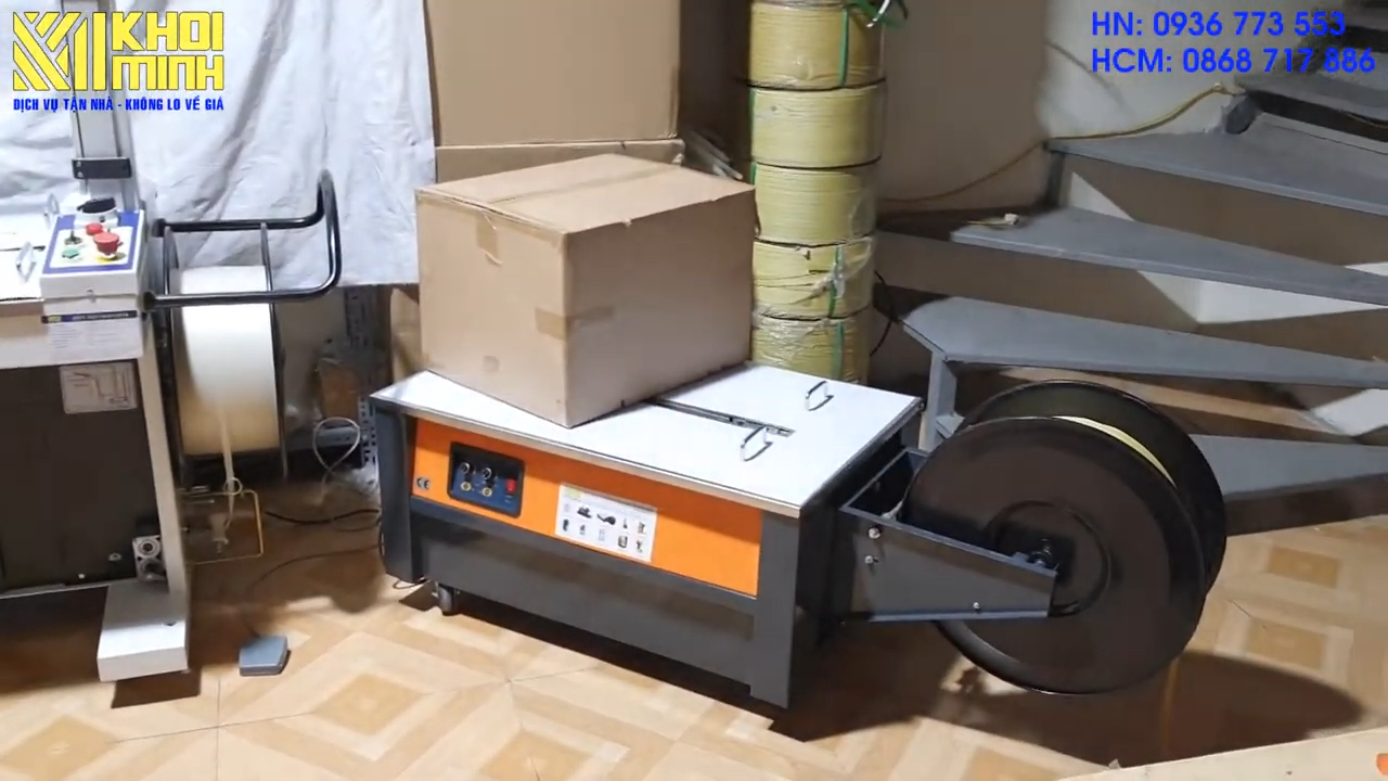 Tiếp theo là dòng máy đóng đai bán tự động. Đây là dòng máy được sử dụng khá phổ biến tại các kho hàng hoặc xưởng sản xuất vừa và nhỏ. Ví dụ như mẫu Máy đóng đai bán tự động KMS‑450. Dòng máy này thường có bàn thấp với chiều cao khoảng 45 cm và sử dụng hai động cơ đến từ Đài Loan. Máy có lực siết khoảng 400N và nhờ sử dụng hệ thống truyền động trực tiếp nên khi hoạt động rất êm. Máy đặc biệt phù hợp với những sản phẩm có khối lượng lớn hoặc thùng hàng cao, giúp người vận hành thao tác dễ dàng hơn. Tổng chiều dài máy khoảng 1,5 m vì cuộn dây đai được đặt ở bên ngoài máy. Dòng máy này chủ yếu sử dụng Dây đai nhựa PP, loại dây đai màu vàng phổ biến với chi phí khá rẻ nên rất được các doanh nghiệp lựa chọn.