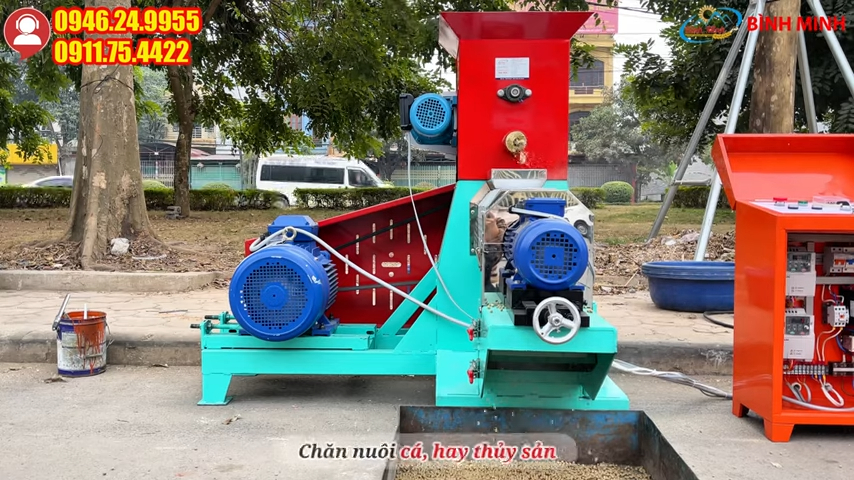 Bước quan trọng nhất trong quá trình sản xuất cám viên nổi tại nhà chính là công đoạn ép đùn thành cám viên. Máy đùn viên thức ăn chăn nuôi 80kg hiện đang sử dụng động cơ 11kW, vận hành bằng nguồn điện công nghiệp 380V với năng suất đạt từ 60 – 80kg mỗi giờ, được thiết kế nhằm khắc phục các hạn chế trong quá trình sản xuất thức ăn cho cá trước đây. Nhờ đó bà con có thể dễ dàng chuẩn bị lượng thức ăn lớn cho cá trong thời gian ngắn, phục vụ tốt cho các trang trại nuôi cá quy mô lớn.