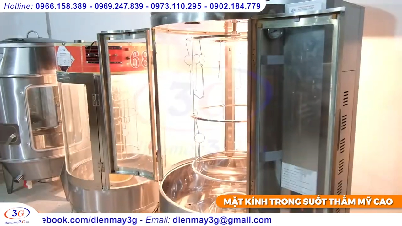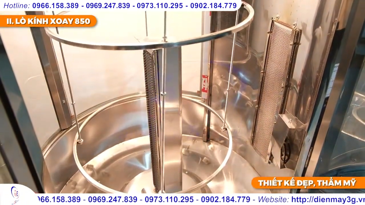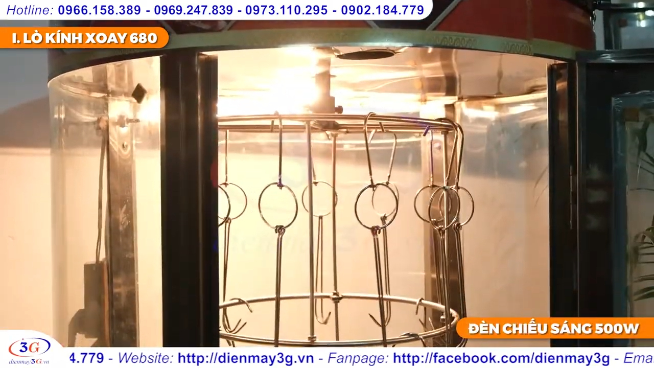 Phần kính của lò quay được thiết kế trong suốt, giúp người dùng dễ dàng quan sát quá trình quay thực phẩm bên trong, đồng thời trưng bày gà vịt quay bắt mắt khi đặt lò tại các quầy bán hàng.