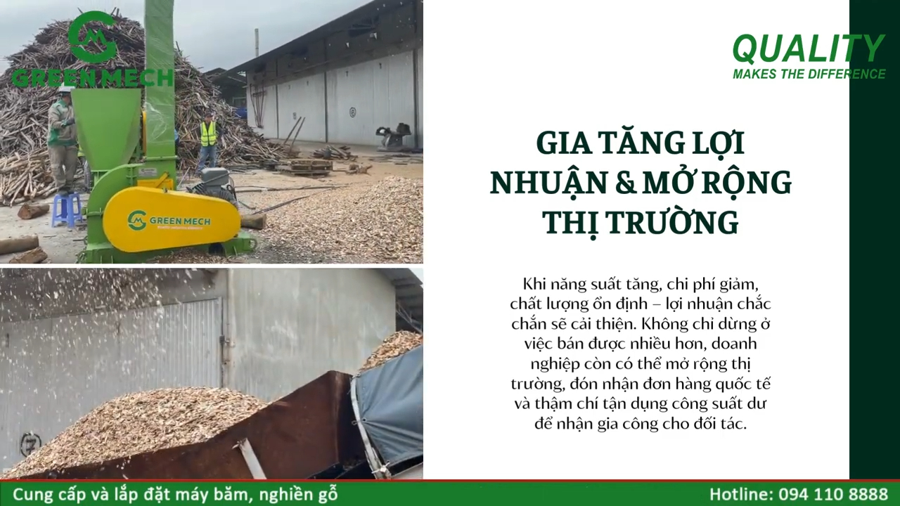Với hơn 15 năm kinh nghiệm trong lĩnh vực chế biến gỗ, GreenMac đã nghiên cứu và phát triển nhiều dòng máy băm gỗ hiện đại nhằm hỗ trợ doanh nghiệp nâng cao năng suất, tiết kiệm chi phí và tận dụng nguồn nguyên liệu hiệu quả. Không chỉ cung cấp thiết bị, GreenMac còn mang đến các giải pháp toàn diện hướng tới sản xuất xanh, bền vững và nâng cao uy tín thương hiệu cho các doanh nghiệp trong ngành chế biến gỗ.