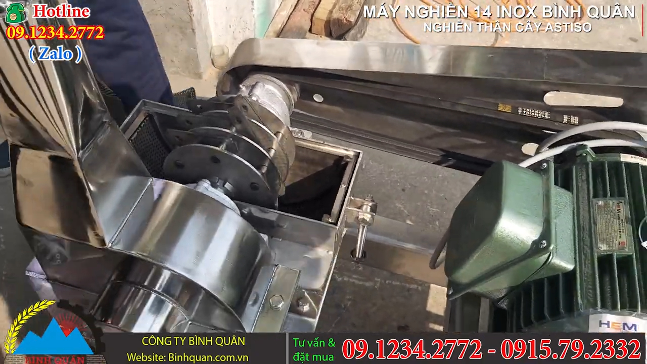 Trước mắt quý vị là dòng Máy nghiền bột inox 14 Bình Quân. Đây là dòng máy do Bình Quân thiết kế và sản xuất, có khả năng đập vỡ, nghiền nhỏ hoặc nghiền mịn nhiều loại nguyên liệu khác nhau. Máy có thể xử lý các loại thảo dược, nấm khô, dược liệu, thân cây thảo mộc hoặc các loại nguyên liệu cứng như nhân sâm và nhiều loại dược liệu khác trong thời gian ngắn với số lượng lớn. Trong video này, máy được sử dụng để nghiền thân Atiso khô nhằm tạo ra nguyên liệu phù hợp cho việc sản xuất Trà túi lọc. Trước khi vận hành, người dùng cần lựa chọn và lắp đặt loại mắt sàng phù hợp để đảm bảo kích thước thành phẩm đạt đúng yêu cầu. Máy cho phép thay đổi nhiều loại mắt sàng khác nhau với kích thước lỗ lớn nhỏ tùy nhu cầu, từ đó có thể điều chỉnh độ mịn của bột theo mục đích sử dụng.