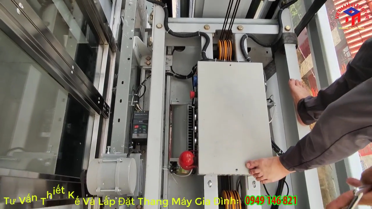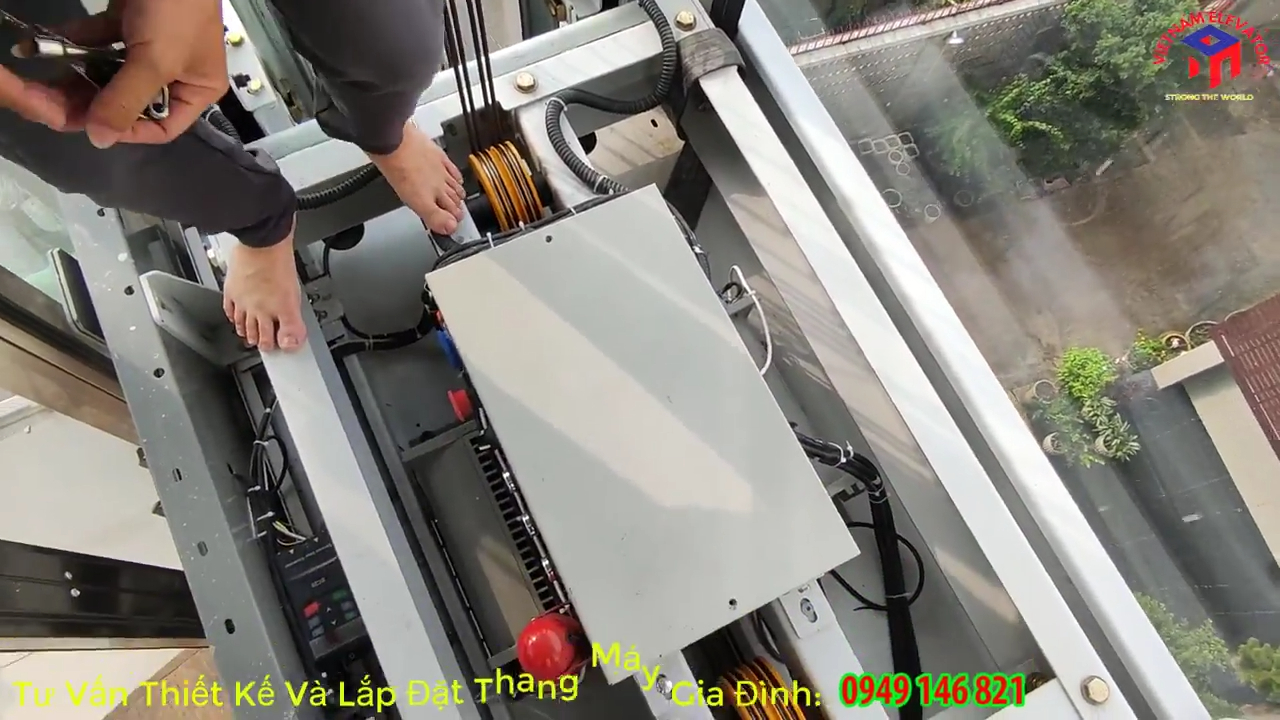 Về thông số kỹ thuật, thang máy ngoài trời này có tải trọng khoảng 320 kg, tương đương sức chứa từ 5 đến 6 người mỗi lần di chuyển. Kích thước hố thang được thiết kế rộng khoảng 1,8 mét và sâu 1,3 mét, trong khi cabin thực tế có kích thước khoảng 1,2 mét x 1,0 mét, tạo tỷ lệ cân đối và đủ rộng cho nhu cầu sử dụng của gia đình. Hệ thống truyền động sử dụng máy kéo Sicor nhập khẩu từ Italy, nổi tiếng với khả năng vận hành êm ái và độ bền cao. Bộ điều khiển sử dụng bo mạch GEFRAN cũng đến từ Italy với công nghệ dừng tầng trực tiếp, giúp cabin dừng chính xác và hạn chế tối đa rung giật khi thang bắt đầu hoặc kết thúc hành trình.