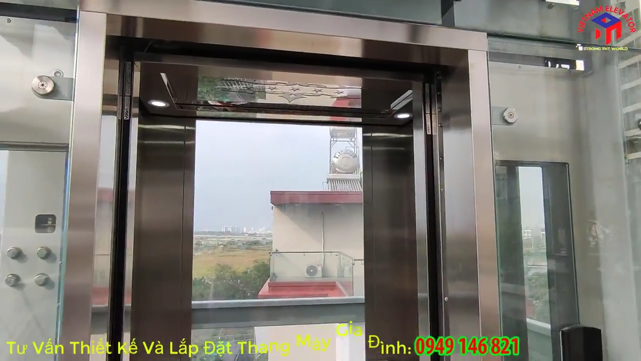 Về kết cấu, thang máy được thiết kế với hệ khung thép chịu lực chắc chắn đặt sát bên hông nhà. Khung thép được gia công đồng bộ và sơn tĩnh điện để đảm bảo khả năng chống gỉ khi lắp đặt ngoài trời trong thời gian dài. Toàn bộ vách hố thang và cabin đều sử dụng kính cường lực dày 10 mm, tạo hiệu ứng kính tràn viền giúp không gian thang máy luôn thông thoáng và có tầm nhìn rộng. Khi cabin di chuyển lên cao, người sử dụng có thể quan sát toàn bộ không gian xung quanh, mang lại trải nghiệm rất thú vị giống như một thang máy panorama trong các công trình hiện đại.