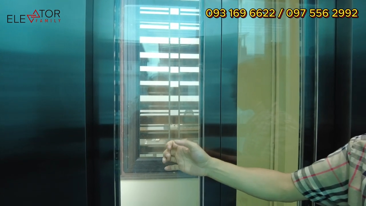 Mặt trước của thang sử dụng kính phủ toàn bộ để tạo sự liền khối và tăng tính thẩm mỹ. Bảng gọi tầng cũng được thiết kế đồng bộ với vật liệu của cabin và có thêm nút mở cửa tầng. Với mẫu thang sử dụng inox gương đen như thế này thì kính nên chọn loại kính tối màu để tạo sự đồng bộ và sang trọng cho toàn bộ hệ thống.