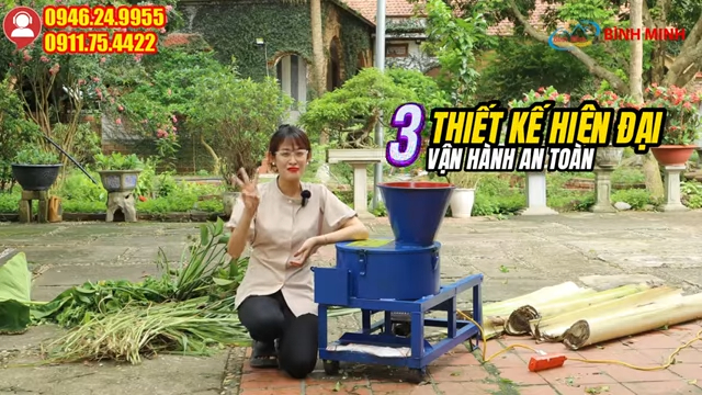Ưu điểm thứ ba là thiết kế hiện đại, vận hành an toàn. Máy được thiết kế với cửa nạp nguyên liệu đặt nghiêng thuận tiện, giúp bà con đứng ở nhiều vị trí khác nhau vẫn có thể dễ dàng đưa nguyên liệu vào máy. Phễu nạp được làm sâu và rộng giúp hạn chế tối đa nguy cơ tiếp xúc với bộ phận dao bên trong, đảm bảo an toàn cho người sử dụng.