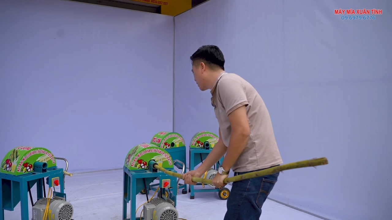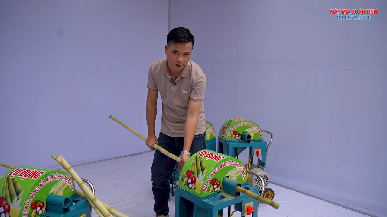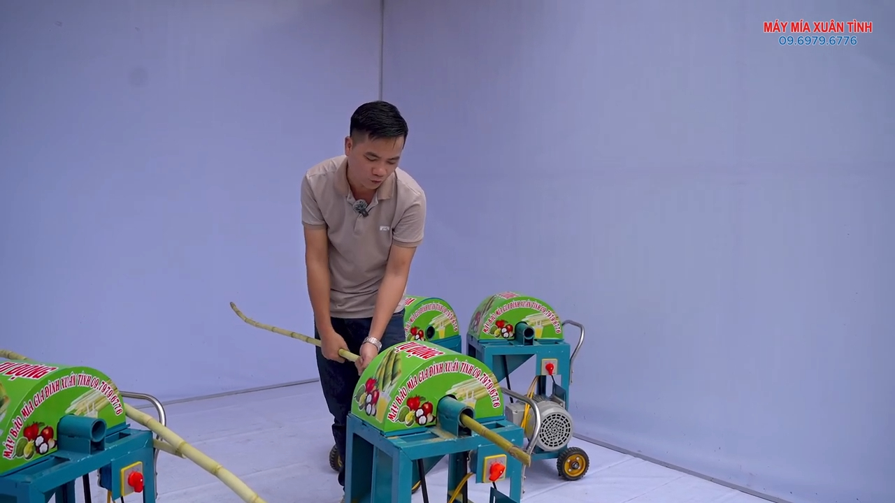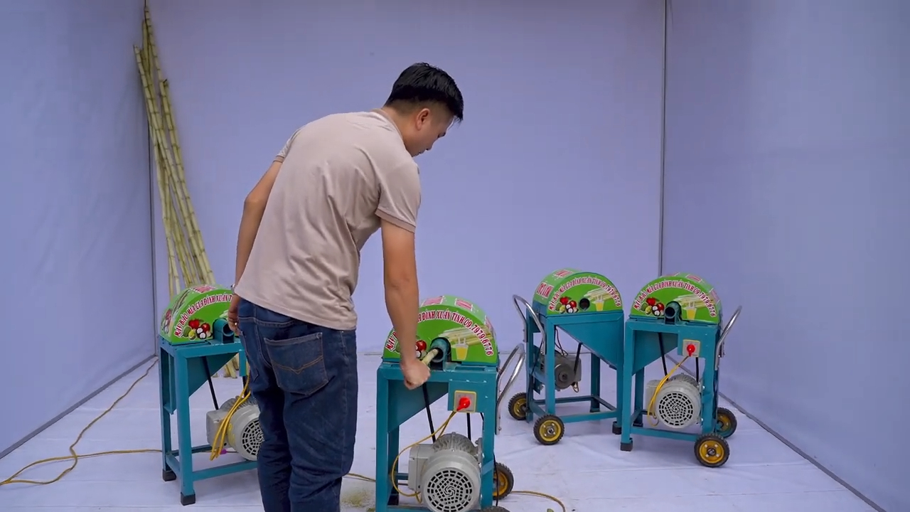 Hiện tại em đang trực tiếp thử máy tại đây để quý vị có thể xem rõ khả năng làm việc của nó. Đây là dòng máy bào mía gia đình 1 cây, giá thành chỉ khoảng 5 triệu đồng. Với mức giá này nhưng năng suất của máy vẫn đạt khoảng 4–5 tạ mía mỗi ngày. Máy sử dụng động cơ khoảng 1.5 kW, và đặc biệt động cơ được bảo hành tới 15 tháng nên người sử dụng có thể yên tâm khi đầu tư.