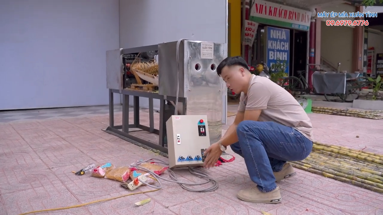 Về kích thước tổng thể, máy có thiết kế khá gọn gàng và chắc chắn. Chiều dài của máy khoảng 1m90, chiều rộng khoảng 50cm, phù hợp để đặt trong các quán nước mía hoặc cơ sở kinh doanh mía ép. Xung quanh thân máy được trang bị 6 hộp che bảo vệ, giúp đảm bảo an toàn trong quá trình vận hành, hạn chế tối đa việc tiếp xúc trực tiếp với các bộ phận chuyển động bên trong máy.