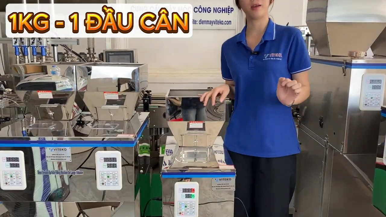 Và bây giờ chúng ta sẽ cùng bắt đầu tìm hiểu về thiết bị đầu tiên. Trước tiên tôi xin giới thiệu đến anh chị máy cân định lượng 1kg – 1 đầu cân. Đây là dòng máy được thiết kế nhỏ gọn, phù hợp cho các cơ sở sản xuất hoặc đóng gói quy mô vừa và nhỏ.