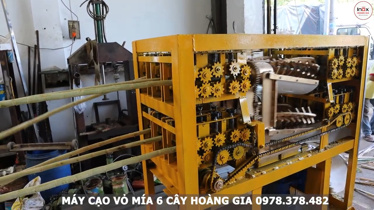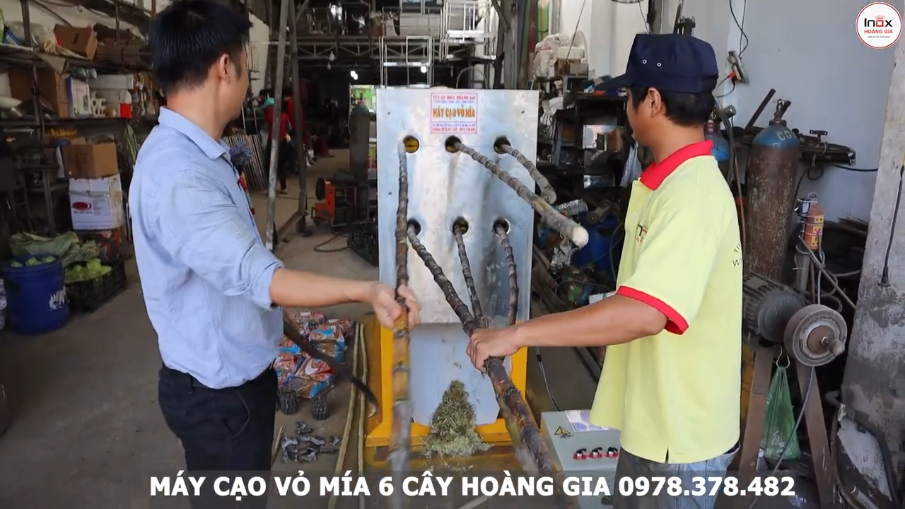 Ở đây mình thử chạy hai bó mía, mỗi bó khoảng 6 cây, tổng cộng 12 cây. Sau khi bào xong thì mía sẽ đi ra phía trước của máy. Toàn bộ mía sau khi bào nhìn rất sạch và bóng. Chỉ có phần cuối ngọn đôi khi còn hơi dính một chút vỏ nhưng không đáng kể. Nếu cần thì có thể cho chạy lại một lần nữa là sạch hoàn toàn.