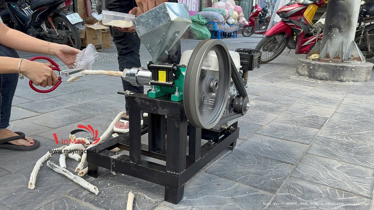 Khung máy được thiết kế linh hoạt, có thể điều chỉnh cao thấp để phù hợp với mọi loại đầu đùn bỏng. Dù đầu đùn cao hay thấp, người dùng đều có thể dễ dàng căn chỉnh để máy khớp chính xác với vị trí bỏng ra, giúp quá trình cắt diễn ra trơn tru và liên tục. Thực tế vận hành cho thấy, khi sử dụng động cơ 12V, lát bỏng cắt ra đạt độ đồng đều cao, không bị vỡ nát, đáp ứng tốt yêu cầu thẩm mỹ khi bán trực tiếp hoặc đóng gói.