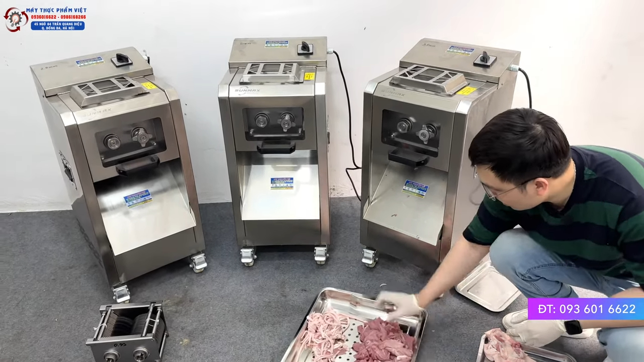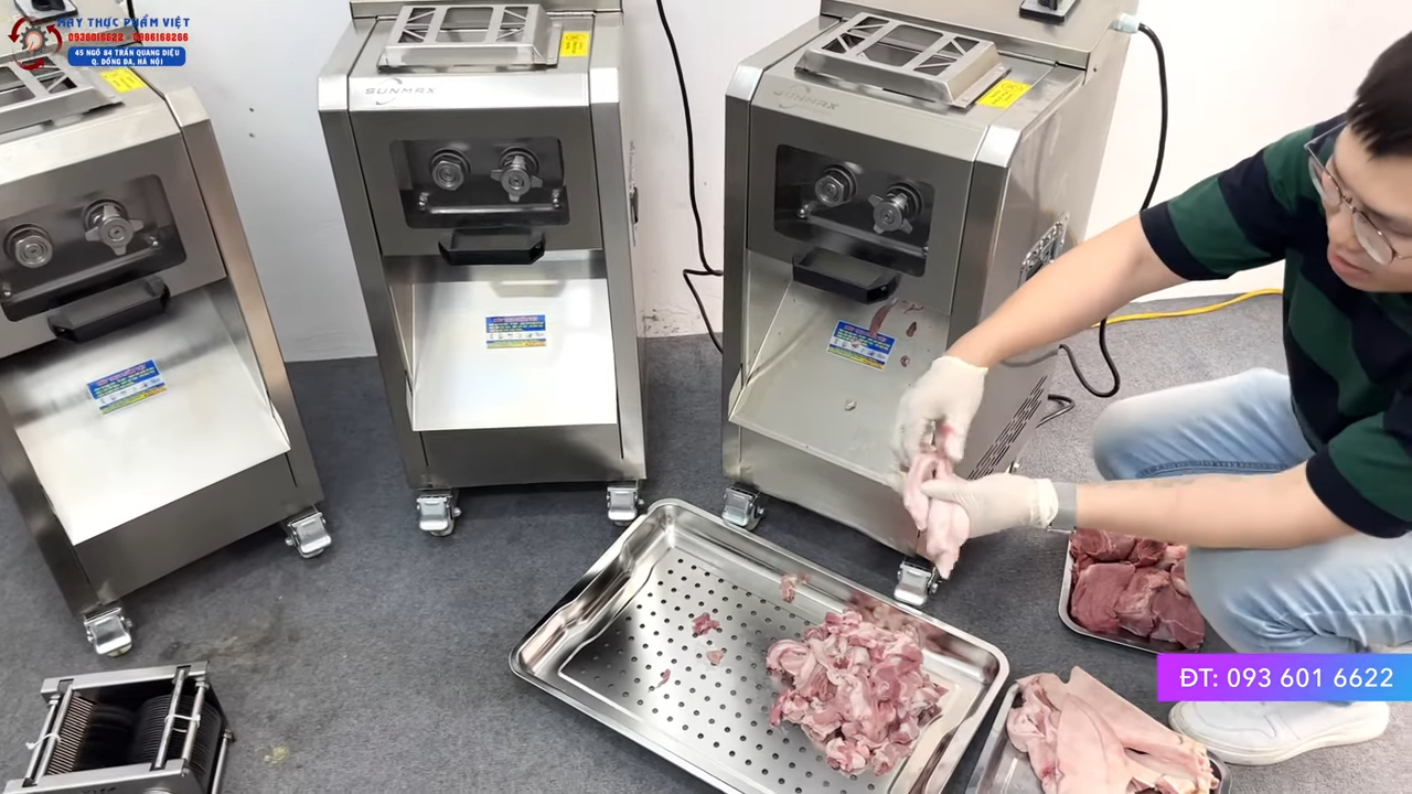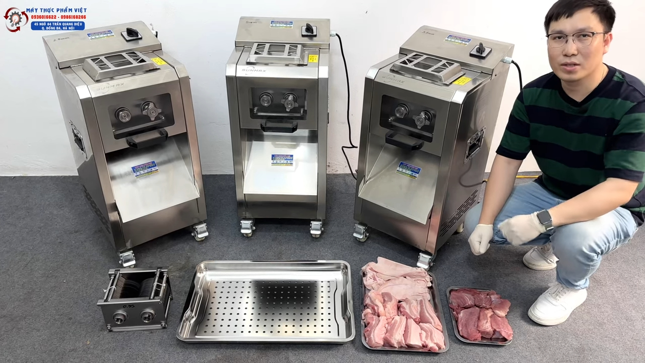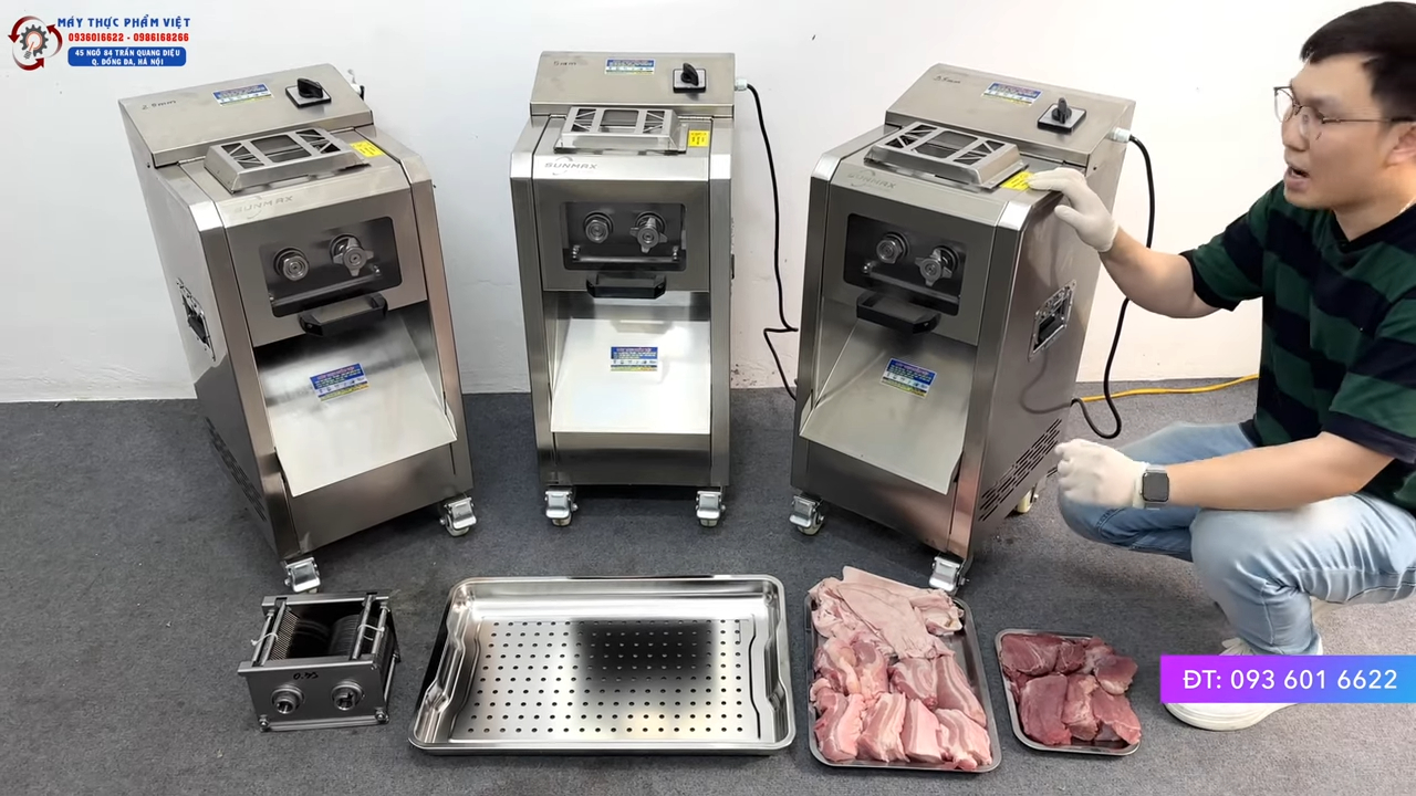 Máy được thiết kế 100% inox chắc chắn, hoạt động ổn định với motor 2.2kW mạnh mẽ, giúp máy có thể thái thịt nhanh với năng suất khoảng 200kg mỗi giờ.
