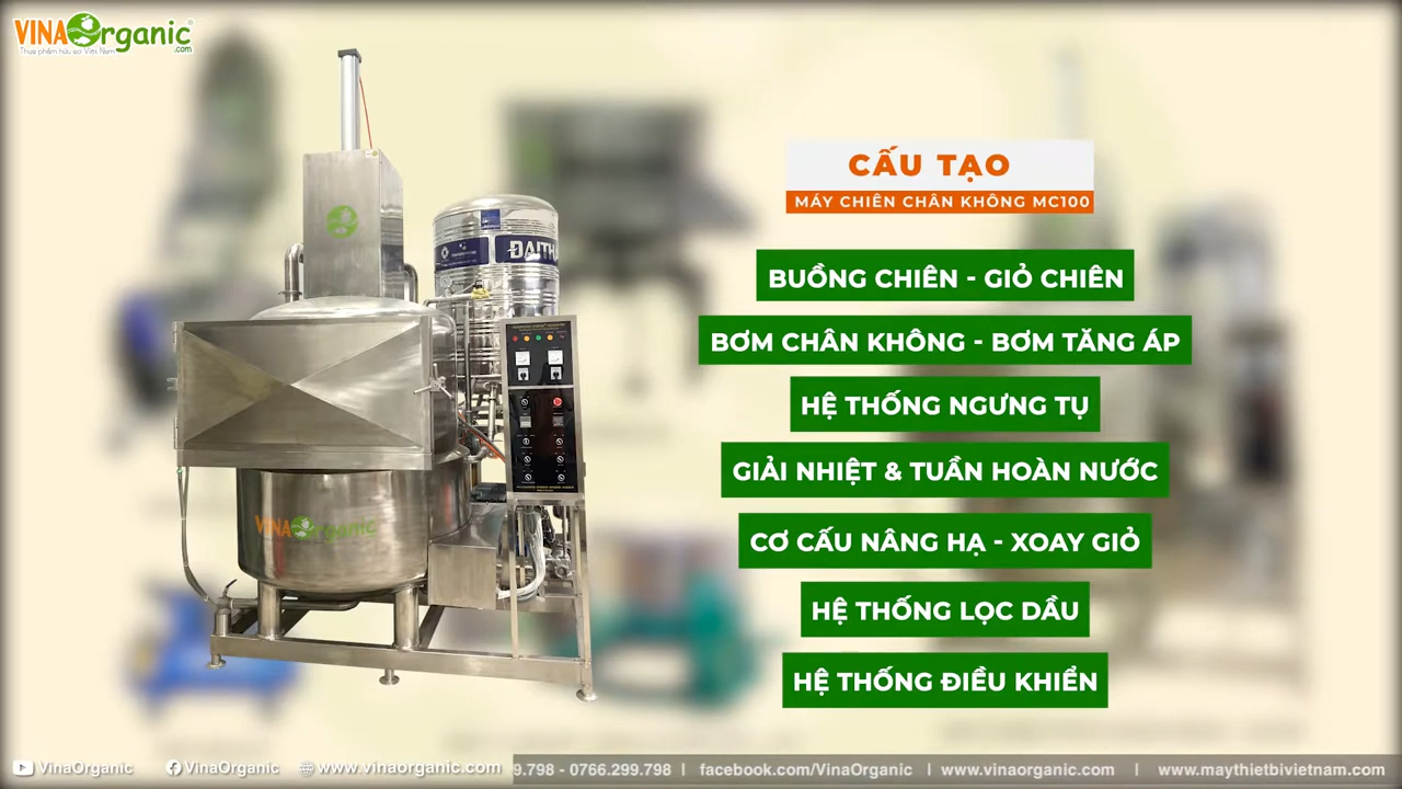 Máy chiên chân không 100kg là dòng máy công suất lớn, phù hợp cho các nhà máy chế biến nông sản quy mô công nghiệp. Trong dây chuyền sản xuất, hệ thống chiên chân không thường đi kèm với các thiết bị hỗ trợ như máy ly tâm tách dầu, hệ thống gia nhiệt, hệ thống ngưng tụ và các thiết bị phụ trợ khác. Cấu tạo của máy chiên chân không bao gồm nhiều bộ phận quan trọng như buồng chiên, giỏ chiên, hệ thống tạo chân không, buồng tách dầu, hệ thống ngưng tụ hơi nước, hệ thống gia nhiệt và hệ thống điều khiển trung tâm. Tất cả các bộ phận này được thiết kế đồng bộ để đảm bảo máy hoạt động ổn định và hiệu quả. Tùy theo năng suất và loại nguyên liệu cần chiên, kích thước và công suất của các bộ phận sẽ được tính toán phù hợp. Tuy nhiên, yếu tố quan trọng nhất vẫn là đảm bảo độ kín của toàn bộ hệ thống để có thể tạo được môi trường chân không ổn định trong quá trình chiên.