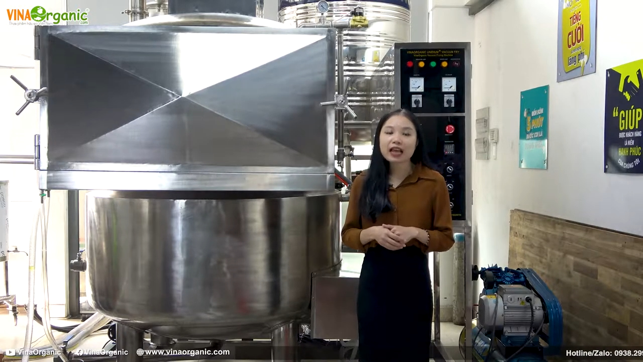 Trước khi bắt đầu, nếu các bạn quan tâm đến các giải pháp chế biến nông sản và công nghệ thực phẩm, hãy đăng ký và theo dõi kênh để VNOrganic có thêm động lực mang đến nhiều nội dung hữu ích hơn nữa. Chiên chân không là công nghệ chiên nguyên liệu trong điều kiện áp suất thấp, tức là môi trường chân không. Nguyên liệu được chiên trong một buồng kín, nơi áp suất được giảm xuống bằng hệ thống bơm chân không. Khi áp suất giảm, nhiệt độ sôi của dầu cũng giảm theo, thường chỉ dưới 100°C. Nhờ vậy, quá trình chiên diễn ra ở nhiệt độ thấp hơn so với chiên thông thường, giúp giữ được màu sắc tự nhiên, hương vị và giá trị dinh dưỡng của nguyên liệu tươi. Đây là công nghệ tiên tiến được ứng dụng rộng rãi trên thế giới, tuy nhiên việc thiết kế và chế tạo hệ thống máy chiên chân không công suất lớn đòi hỏi trình độ kỹ thuật cao và quá trình nghiên cứu nghiêm túc. Đội ngũ kỹ sư của VNOrganic đã dành rất nhiều thời gian để tính toán, thiết kế và thử nghiệm nhằm tạo ra hệ thống máy chiên chân không 100kg hoàn chỉnh, đáp ứng các tiêu chuẩn kỹ thuật và yêu cầu khắt khe của khách hàng.