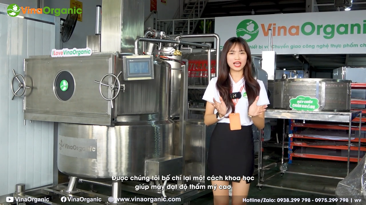VinaOrganic tự hào là một trong những đơn vị tiên phong trong lĩnh vực nghiên cứu và chế tạo máy chiên chân không tại thị trường Việt Nam. Và ngay bên cạnh Hoa đây chính là chiếc máy chiên chân không với năng suất 50kg nguyên liệu cho mỗi mẻ. Model này có mã VC-50 và nằm trong series máy chiên chân không phiên bản nâng cấp mới nhất năm 2024 do VinaOrganic nghiên cứu và chế tạo. Đây là dòng máy có năng suất lớn, vì vậy thiết bị được đầu tư rất kỹ về thiết kế cơ khí, công nghệ vận hành cũng như hệ thống điều khiển để đảm bảo rằng sản phẩm sau khi chiên đạt độ giòn xốp tốt nhất. Và ngay bây giờ chúng ta hãy cùng tìm hiểu xem chiếc máy này có những ưu điểm đặc biệt nào.