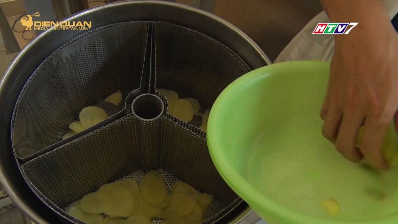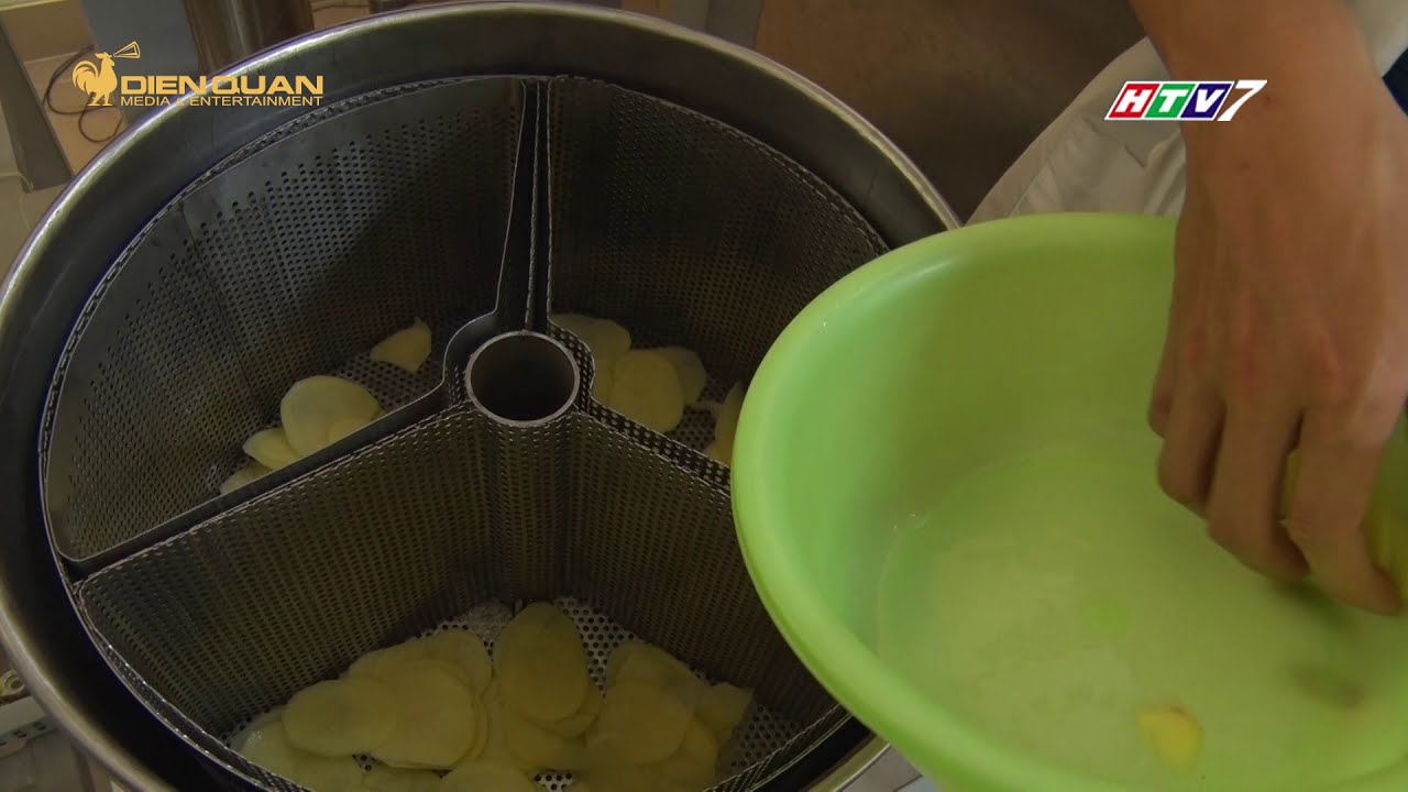 Với nguyên liệu ban đầu, sau khi sơ chế sạch, rau củ hoặc trái cây sẽ được đưa vào thiết bị làm khô để loại bỏ bớt lượng nước, sau đó cho vào nồi chiên. Hệ thống còn được trang bị bộ phận làm lạnh và ngưng tụ nhằm tách nước thoát ra từ sản phẩm trong quá trình chiên. Sau khi hoàn thành quá trình chiên, sản phẩm sẽ được đưa sang máy ly tâm để tách dầu, giúp sản phẩm khô ráo và giòn hơn. Tổng thời gian chiên thường từ khoảng 8 đến 15 phút tùy theo từng loại nguyên liệu, với công suất khoảng 40 kg cho mỗi mẻ chiên.
