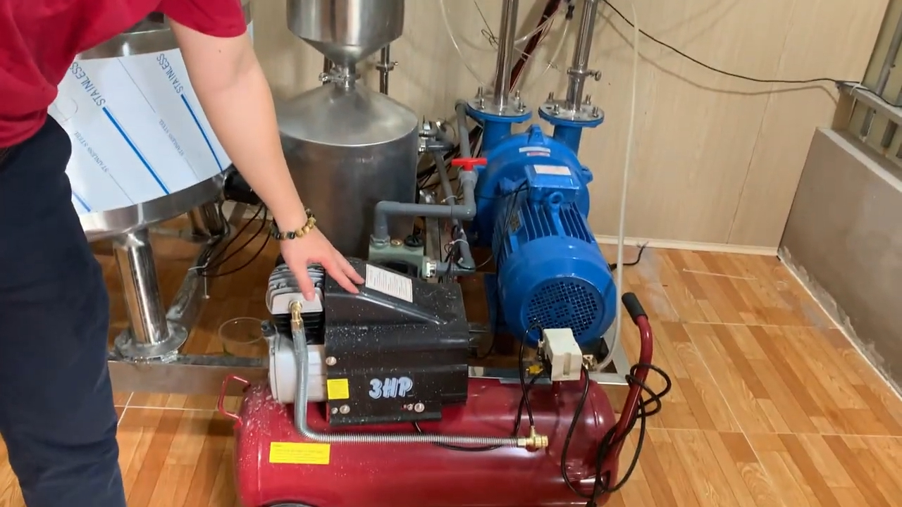 Bên cạnh đó là hệ thống bơm chân không, đây là một bộ phận rất quan trọng của máy chiên chân không. Bơm chân không có nhiệm vụ tạo ra môi trường áp suất thấp bên trong buồng chiên. Khi áp suất giảm xuống, nhiệt độ sôi của dầu cũng giảm theo, nhờ vậy thực phẩm được chiên ở nhiệt độ thấp hơn so với phương pháp chiên thông thường. Điều này giúp sản phẩm giữ được màu sắc tự nhiên, không bị cháy sém và hạn chế mất đi các chất dinh dưỡng.