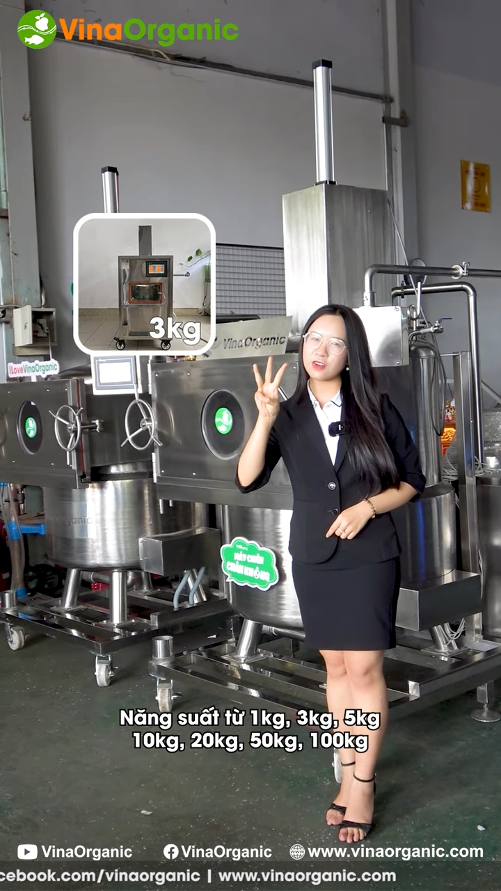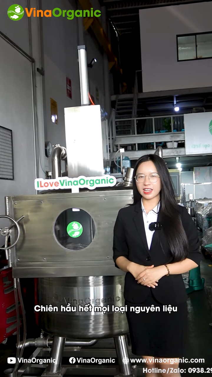 Máy chiên chân không được nghiên cứu, thiết kế và chế tạo hoàn toàn tại Việt Nam bởi đội ngũ kỹ sư và chuyên gia của Vina Organic. Đây là dòng thiết bị được phát triển nhằm phục vụ cho ngành chế biến nông sản, giúp tạo ra các sản phẩm sấy giòn chất lượng cao. Máy chiên chân không của Vina Organic có nhiều mức công suất khác nhau để phù hợp với từng quy mô sản xuất như 1 kg, 3 kg, 5 kg, 10 kg, 20 kg, 30 kg, 50 kg và các dòng máy công suất lớn hơn theo yêu cầu của doanh nghiệp. Nhờ sự đa dạng này, từ các cơ sở khởi nghiệp nhỏ cho đến các nhà máy chế biến thực phẩm đều có thể lựa chọn được thiết bị phù hợp.