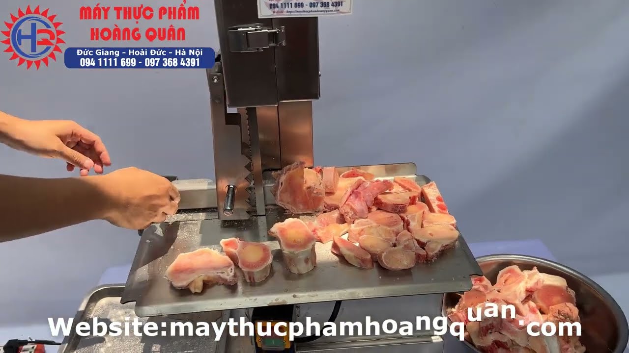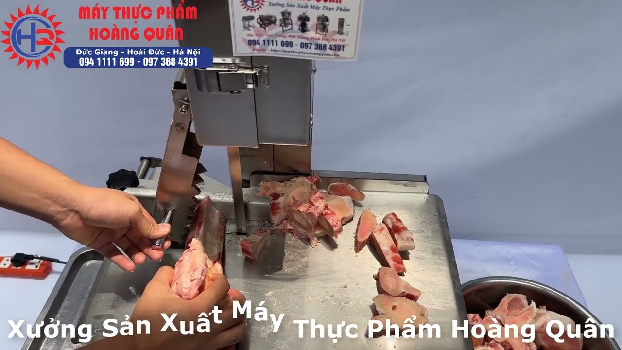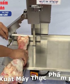 Trong quá trình cắt, anh em nên sử dụng tay gạt đẩy nguyên liệu để đảm bảo an toàn. Khi dùng tay gạt này đẩy thịt hoặc xương qua lưỡi cưa thì tay của mình sẽ không tiếp xúc trực tiếp với lưỡi cưa, tránh được nguy cơ bị thương.