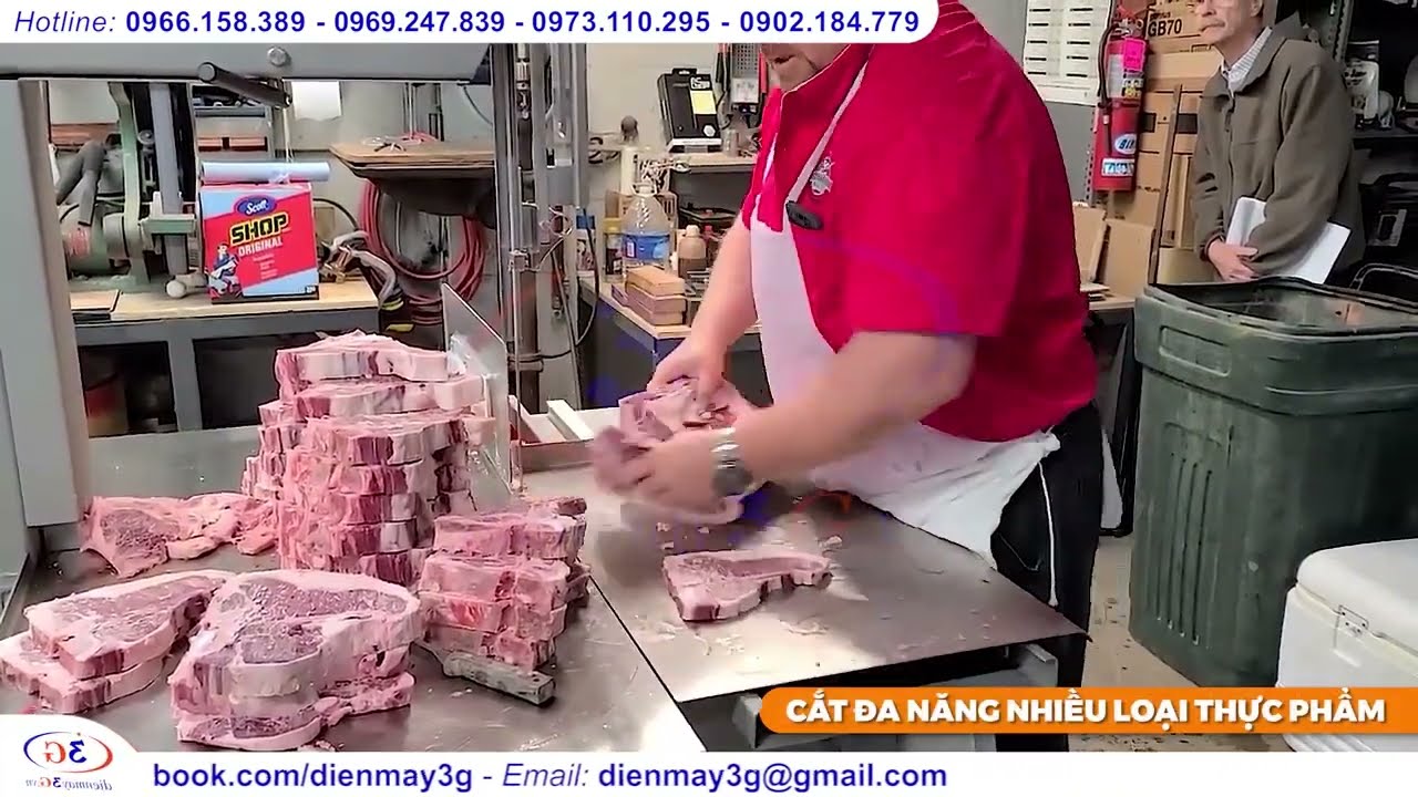 Lưỡi cưa được làm từ thép cứng với độ dày chỉ khoảng 0,4 mm nên rất sắc bén, giúp cắt nhanh, gọn và hạn chế hao hụt nguyên liệu. Máy có thể cắt đa dạng nhiều loại thực phẩm như xương động vật, thịt đông lạnh, cá đông lạnh, hải sản đông lạnh hoặc gia cầm đông lạnh. Các lát cắt sau khi hoàn thành sẽ đồng đều, chính xác và đẹp mắt.