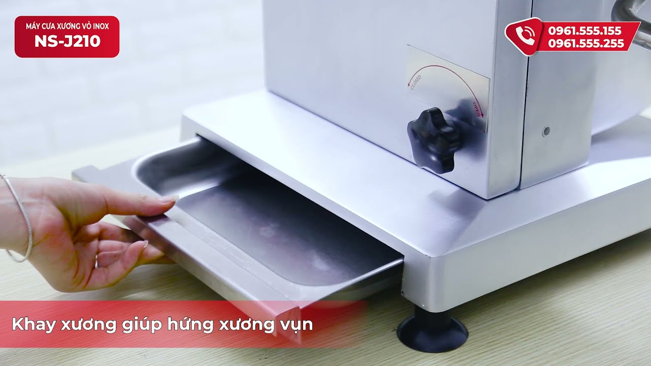 Bàn cắt được làm từ inox cao cấp dày và chắc chắn, chịu lực tốt nên có thể đặt khối lượng lớn nguyên liệu mà không bị cong hay biến dạng. Phía dưới máy còn có khay hứng vụn xương, giúp giữ vệ sinh và dễ dàng làm sạch sau khi sử dụng.