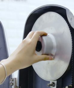 - Bước 1: Kiểm tra máy bằng cách mở cửa thân máy, dùng tay xoay puli trên khoảng 10 – 20 vòng để kiểm tra độ trơn của lưỡi cưa. Nếu lưỡi cưa chuyển động trơn tru thì máy đã sẵn sàng hoạt động. Sau đó đóng cửa máy lại và khóa chốt an toàn.