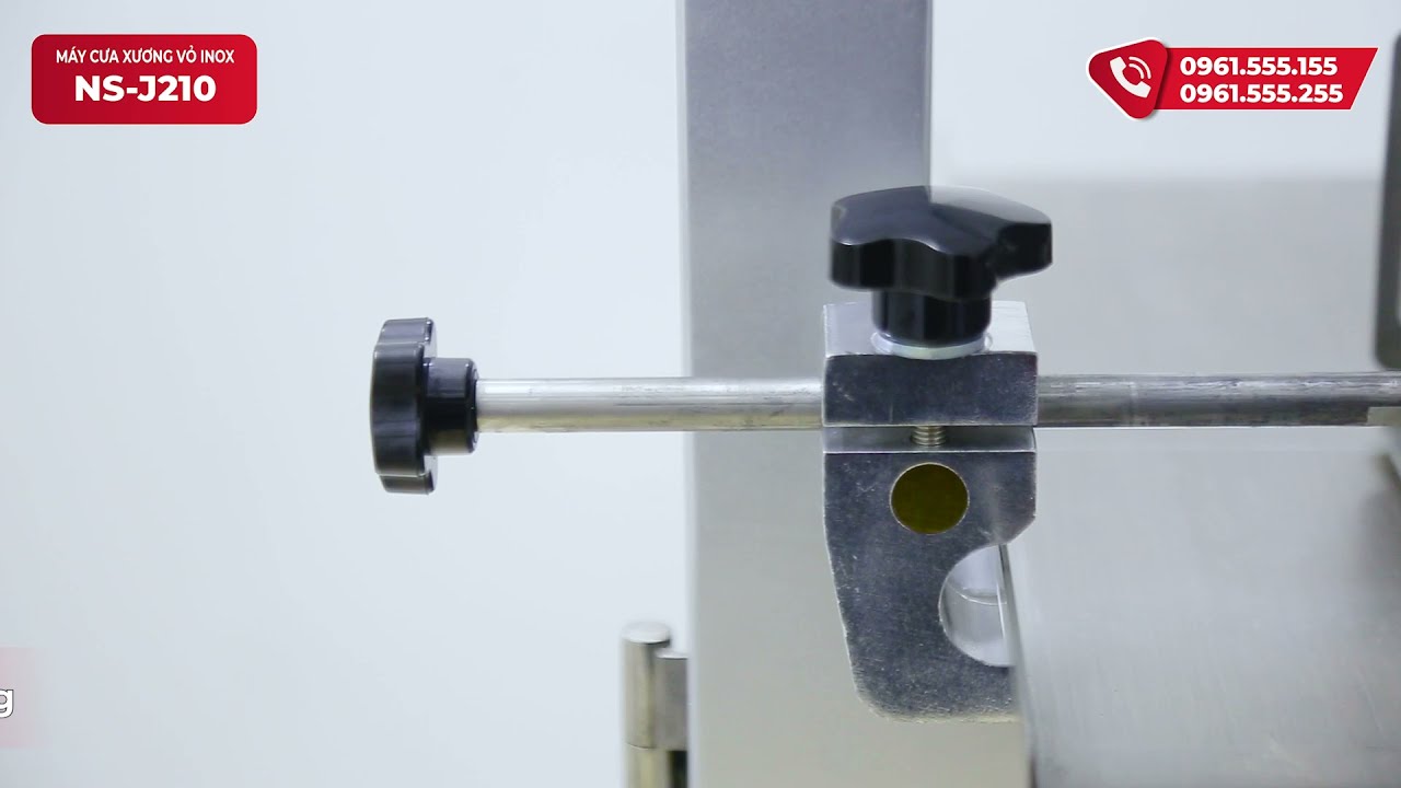 Cần gạt của máy giúp đẩy nguyên liệu qua lưỡi cưa một cách an toàn, tránh để tay tiếp xúc trực tiếp với lưỡi cưa. Thước đo trên máy cho phép điều chỉnh độ dày lát cắt từ 5mm đến 150mm, giúp bạn dễ dàng cắt xương theo kích thước mong muốn.