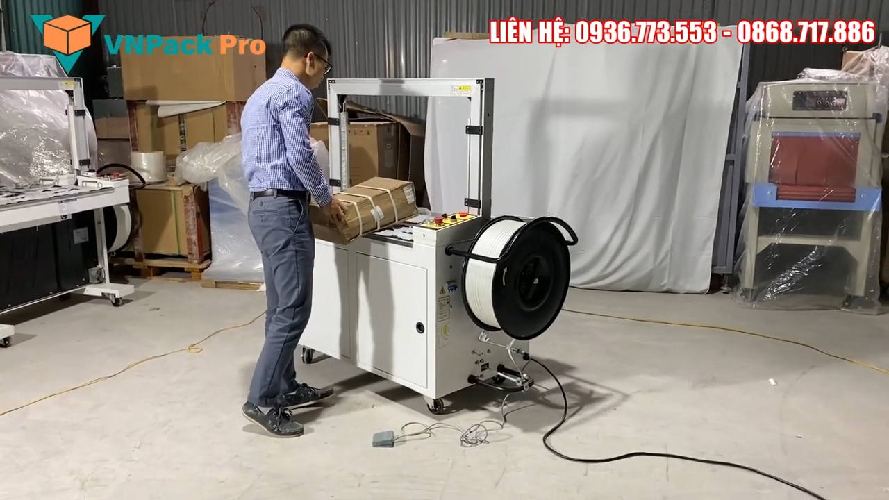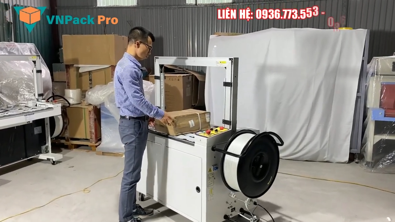 Tốc độ làm việc của máy khá cao, trung bình có thể đạt khoảng 25 đến 30 vòng đai mỗi phút. Lực siết dây cũng có thể điều chỉnh thông qua núm vặn điều chỉnh trên thân máy với khoảng 10 mức lực khác nhau để phù hợp với từng loại thùng carton và sản phẩm bên trong. Nếu các bạn đang có nhu cầu đóng gói thùng carton bằng Dây đai nhựa PP thì có thể tham khảo dòng Máy đóng đai thùng tự động KMS‑101A này. Bên mình hiện có sẵn các dòng máy từ bán tự động đến tự động tại Hà Nội và TP. Hồ Chí Minh, khách hàng có thể mang sản phẩm đến để chạy thử trực tiếp trước khi quyết định đầu tư.
