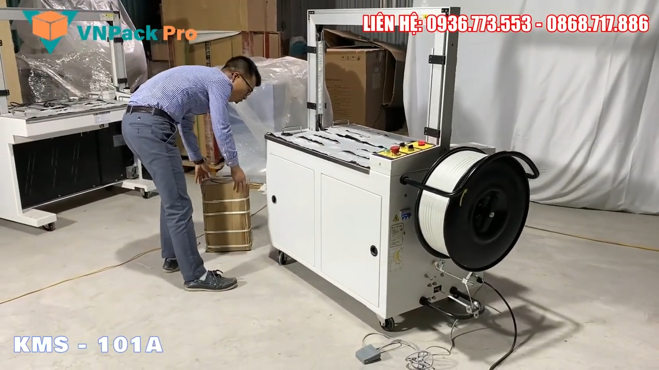 Máy đóng đai thùng tự động KMS‑101A. Trước đây bên mình đã giới thiệu mẫu KMS-150A, vì vậy hôm nay làm video này để các bạn có thêm góc nhìn so sánh giữa hai dòng máy. Về thiết kế bên ngoài thì hai máy khá giống nhau, tuy nhiên cấu tạo và động cơ bên trong của KMS-101A được nâng cấp mạnh mẽ hơn nên hiệu suất làm việc cũng vượt trội hơn. Dòng Máy đóng đai thùng tự động KMS‑101A được trang bị 3 động cơ công suất lớn với tổng công suất khoảng 1500W. Chiều cao mặt bàn của máy khoảng 75 cm, rất thuận tiện khi thao tác đóng gói. Máy có thể sử dụng cho các thùng carton có kích thước tối đa khoảng 80 cm chiều rộng và 60 cm chiều cao. Điều này có nghĩa là các loại thùng hàng nhỏ hơn kích thước này đều có thể đóng đai một cách dễ dàng và nhanh chóng.
