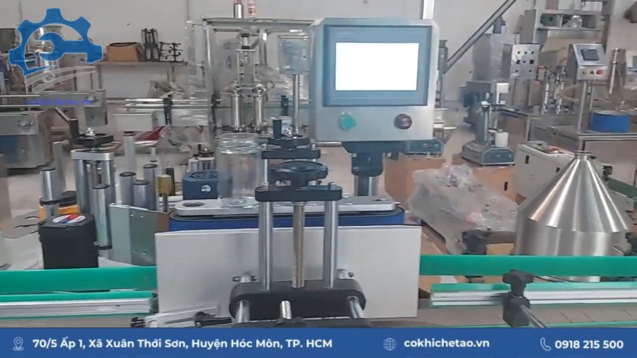 Các con lăn này sẽ giúp dẫn chai đi đều trên băng tải, đảm bảo khi chai đi qua vị trí dán nhãn thì tem sẽ được dán chính xác. Khi chai di chuyển đến khu vực dán, cảm biến sẽ nhận diện chai, sau đó máy sẽ tự động phóng nhãn và dán lên thân chai. Tốc độ phóng nhãn của máy khá nhanh và ổn định, giúp nâng cao năng suất làm việc.