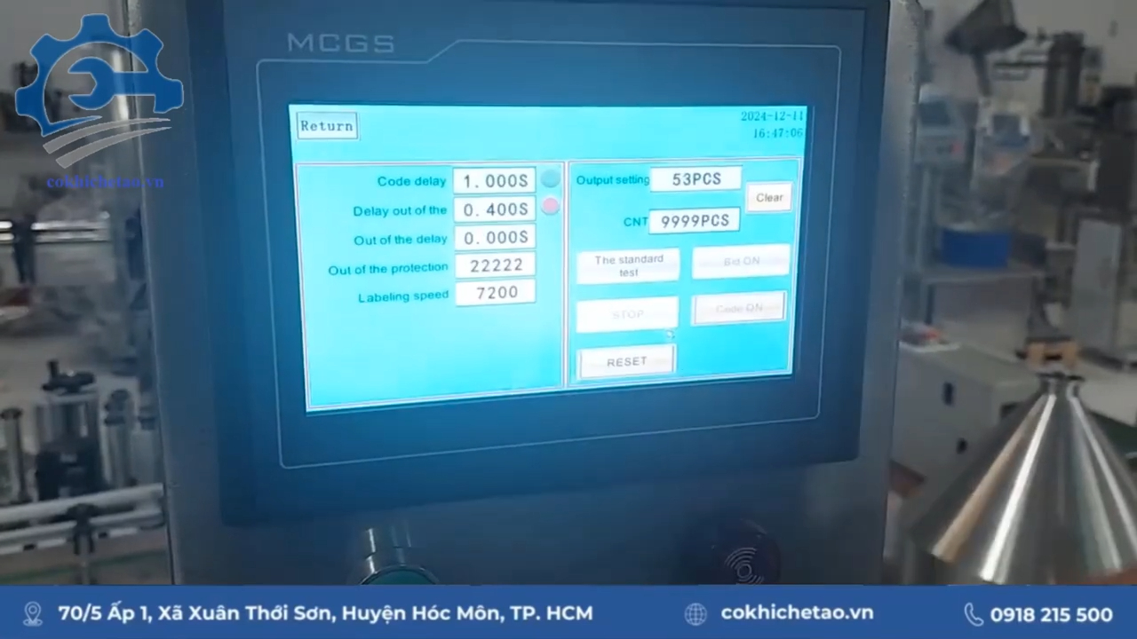 Các nút chức năng trên màn hình bao gồm bật hoặc tắt cảm biến ra nhãn và cảm biến phát hiện nhãn, nút Stop để dừng máy và Reset để đưa máy về trạng thái ban đầu. Sau khi cài đặt xong các thông số như thời gian ra nhãn, thời gian ép nhãn, thời gian trễ hoặc độ trễ của cảm biến, thì có thể tiến hành cho máy hoạt động.