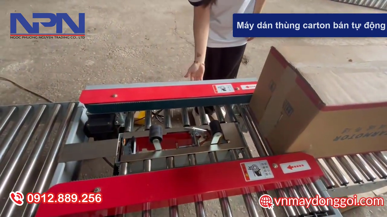 Trong quá trình chạy máy, sản phẩm sẽ được hai bên bánh lăn kẹp và dẫn hướng, đảm bảo sản phẩm đi thẳng và không bị lệch. Hệ thống này giúp quá trình đóng gói hoặc dán thùng diễn ra ổn định, nâng cao hiệu quả làm việc và hạn chế sai sót trong dây chuyền sản xuất. Nhờ thiết kế chắc chắn và đồng bộ giữa động cơ, băng tải và con lăn, máy có thể hoạt động ổn định trong thời gian dài và phù hợp với nhiều môi trường sản xuất khác nhau.