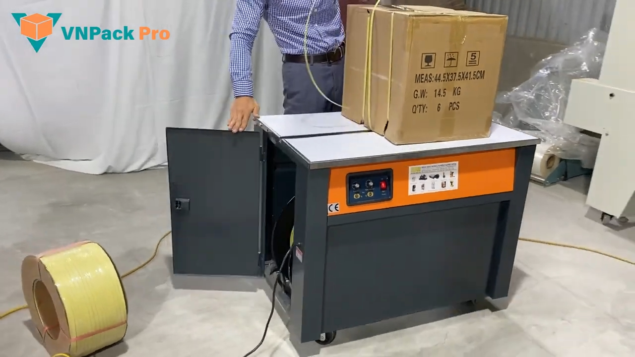 Máy được thiết kế phù hợp để đóng đai các loại thùng carton hoặc kiện hàng trong quá trình đóng gói. Máy không bị giới hạn về chiều cao của kiện hàng, tuy nhiên trọng lượng kiện hàng phù hợp nhất là tối đa khoảng 50 kg. Bên dưới máy có hệ thống bánh xe giúp người dùng dễ dàng di chuyển máy đến các vị trí làm việc khác nhau trong kho hoặc xưởng sản xuất.