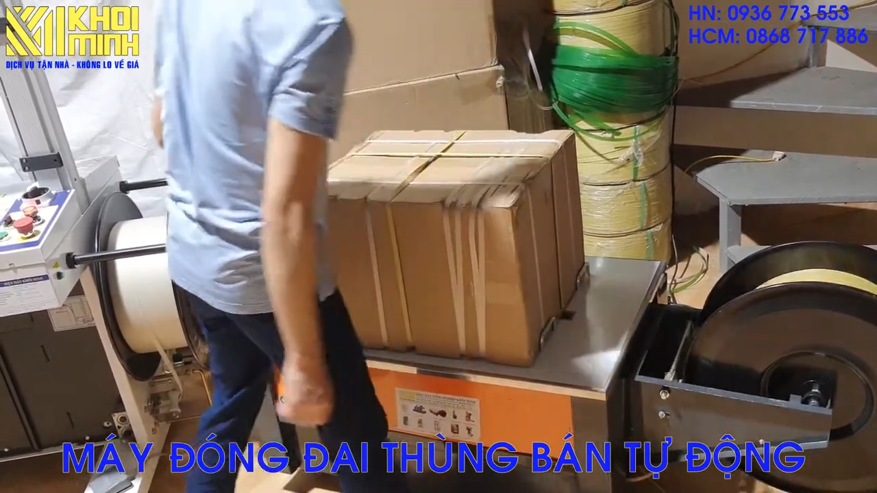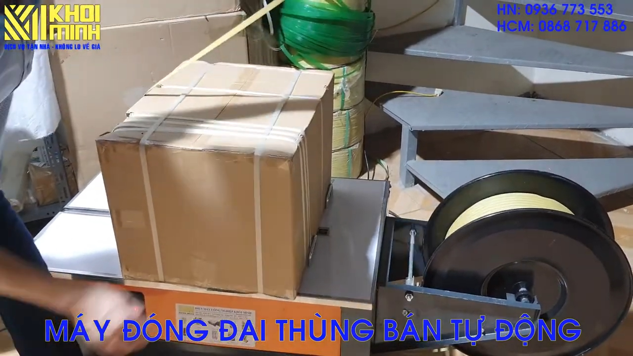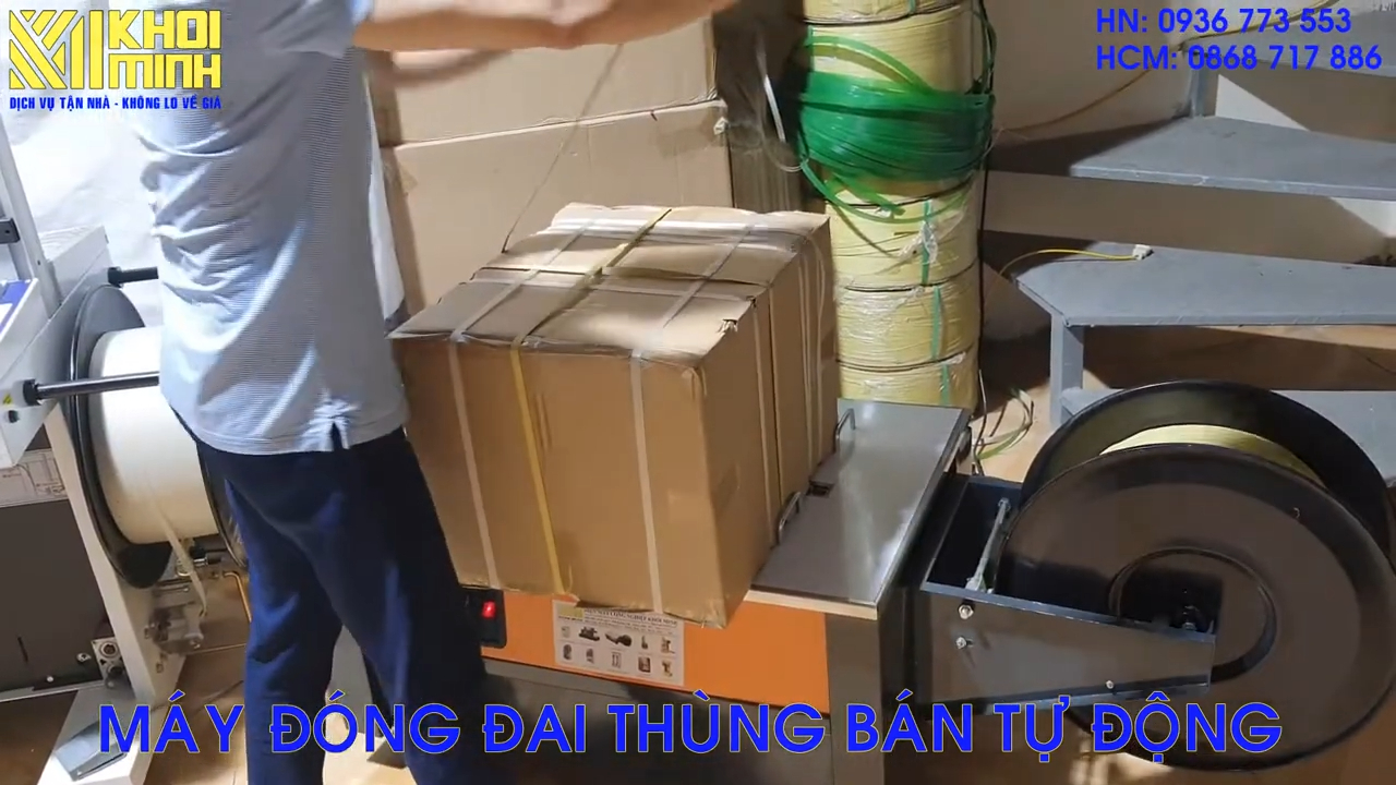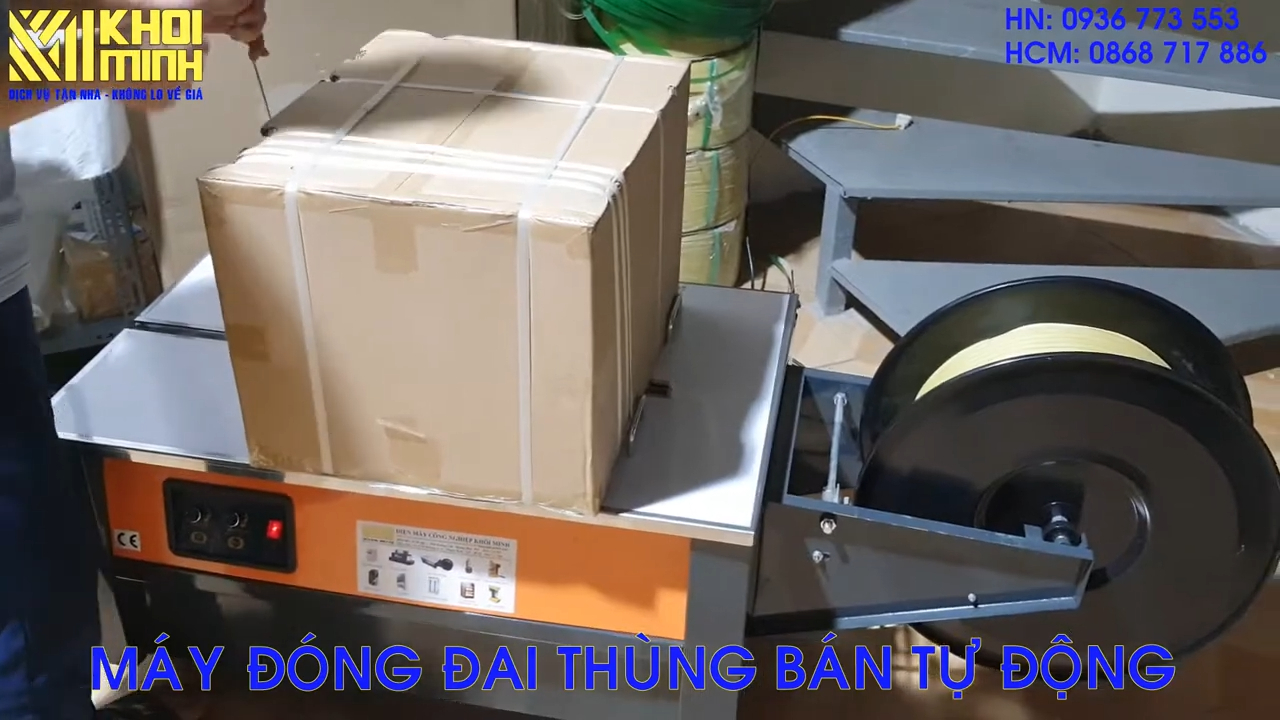 Bây giờ chúng ta sẽ thử đóng đai cho thùng hàng bằng phiên bản bán tự động. Ở đây tôi đã lắp sẵn cuộn dây đai vào máy. Đây là phiên bản Kammer 450, loại bàn thấp. Đối với phiên bản bàn thấp này, như tôi đã nói trước đó, nếu chiều cao của thùng hàng lớn thì việc sử dụng máy sẽ thuận tiện hơn. Vì mặt bàn thấp nên khi luồn dây đai vòng qua thùng hàng, thao tác sẽ dễ dàng và đỡ tốn sức hơn.