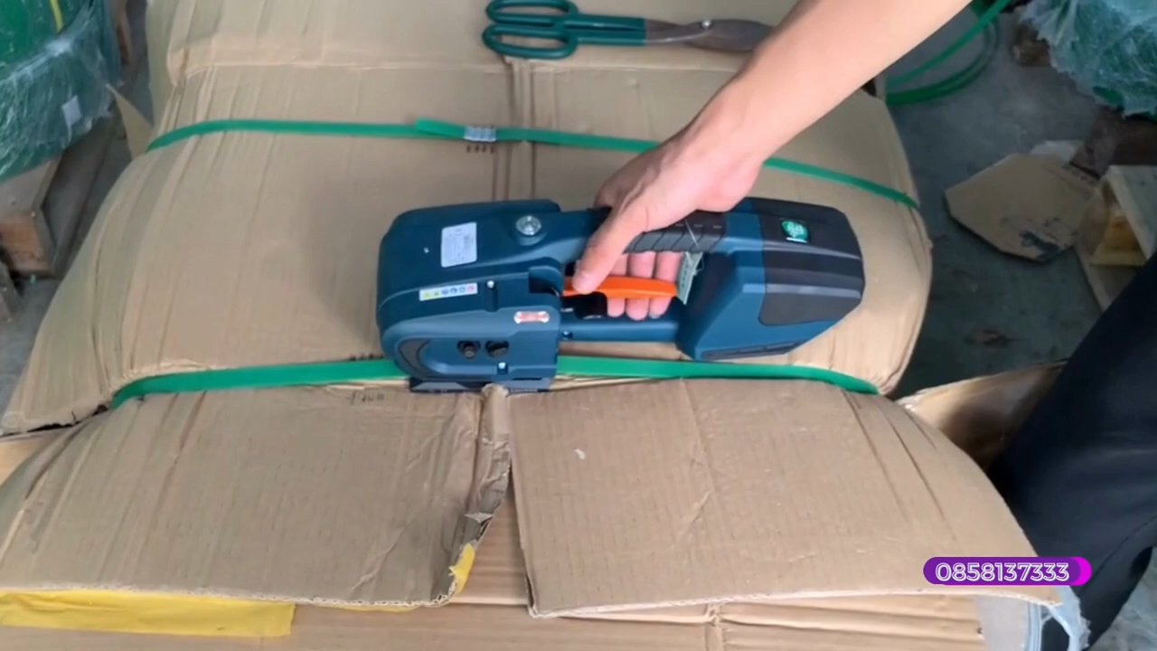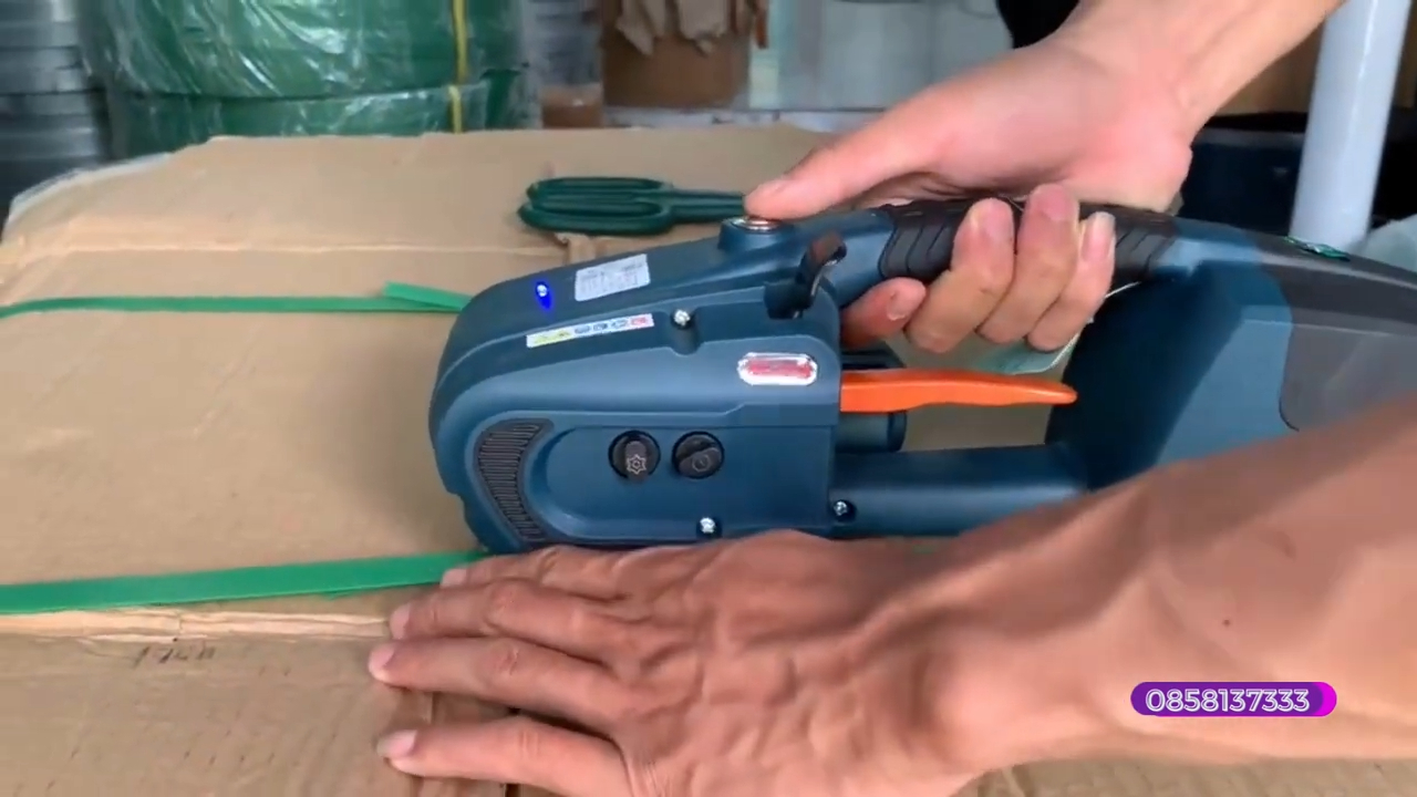 Hôm nay mình xin giới thiệu đến mọi người một dòng máy đóng đai nhựa cầm tay dùng pin. Đây là dòng máy rất tiện lợi, sử dụng cho dây đai PP và dây đai PET có kích thước từ 16mm trở xuống. Đây là kết cấu tổng thể của máy. Máy được trang bị hai cục pin, giúp người dùng có thể thay phiên sử dụng để đảm bảo quá trình làm việc liên tục. Bây giờ mình sẽ lắp thử pin cho các bạn xem. Khi lắp pin vào, đèn báo sẽ sáng lên để thông báo rằng máy đã sẵn sàng hoạt động.
