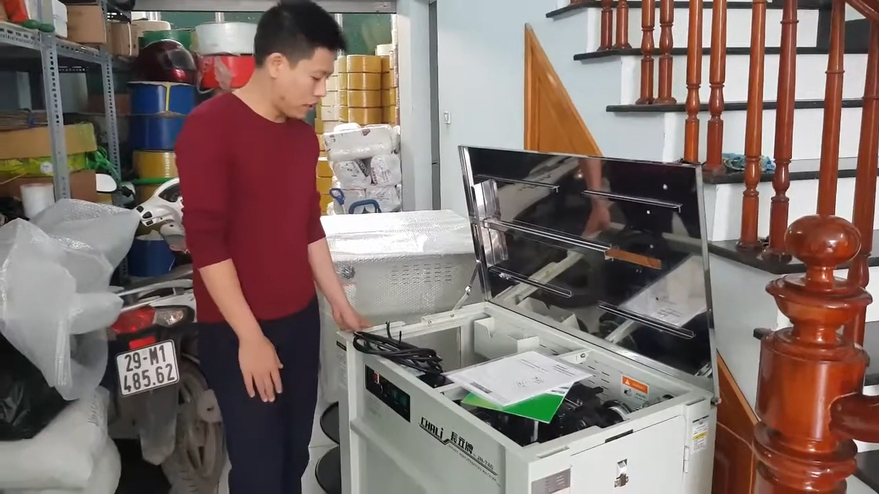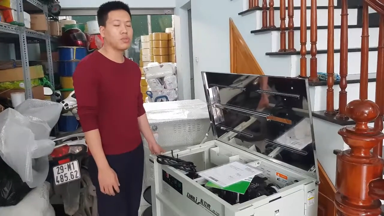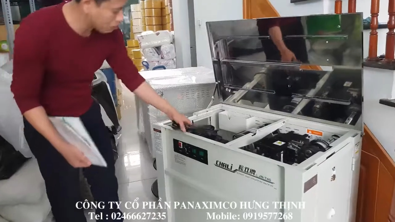 Bây giờ mình sẽ hướng dẫn các bạn cách thao tác và sử dụng máy. Trước tiên chúng ta mở nắp phía trên của máy để kiểm tra và thay dây đai khi cần. Bên trong máy sẽ có một cuộn dây đai đã được lắp sẵn. Khi muốn thay dây mới, chúng ta tháo cuộn dây cũ ra, mở chốt giữ cuộn, sau đó lắp cuộn dây mới vào đúng vị trí. Sau khi đặt cuộn dây vào, cần chú ý căn đúng phần khấc định vị rồi siết chặt lại để cuộn dây không bị lệch trong quá trình máy hoạt động. Khi đã cố định xong, chúng ta đặt cuộn dây vào đúng vị trí ban đầu và đóng nắp máy lại. Tiếp theo là bước xỏ dây đai. Lấy đầu dây đai kéo ra từ cuộn, sau đó lần lượt luồn qua các con lăn dẫn dây trong máy. Đầu tiên là con lăn phía trước, sau đó tiếp tục luồn qua các khe dẫn dây và đưa vào vị trí nạp dây của máy. Sau khi xỏ dây xong, chúng ta có thể đóng nắp máy lại để bắt đầu sử dụng.