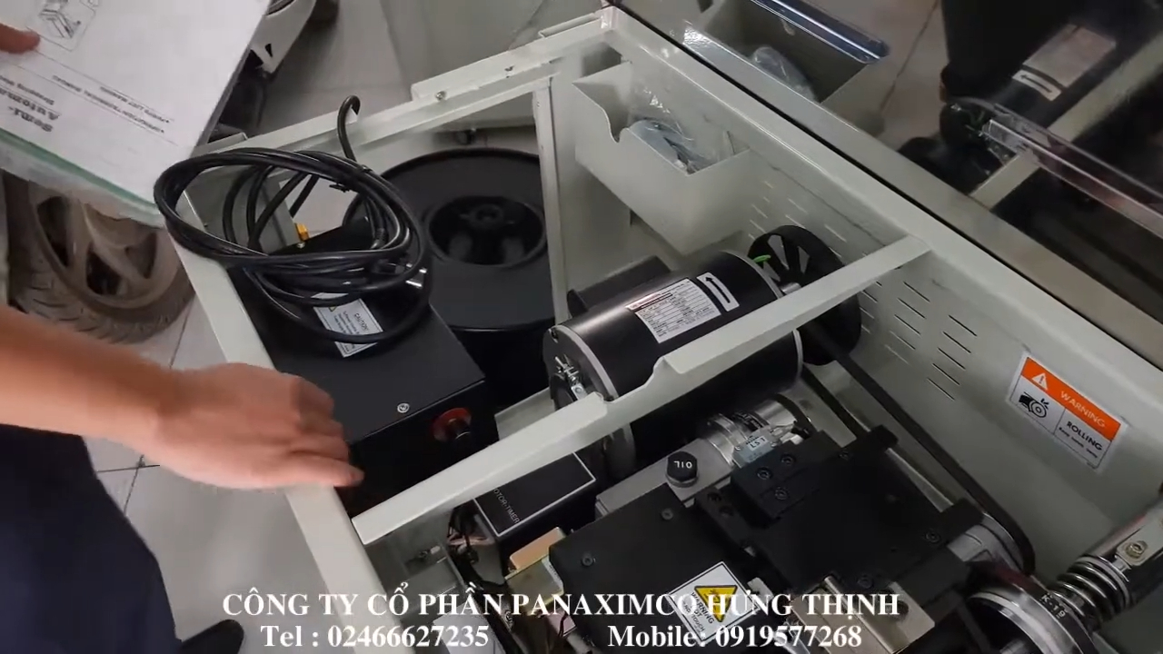 Một vị trí quan trọng khác là bộ điều chỉnh độ rộng dây đai. Chúng ta có thể điều chỉnh bằng cách sử dụng khóa lục giác đi kèm máy để siết hoặc nới hai con ốc điều chỉnh ở vị trí này. Ngoài ra còn có hai điểm điều chỉnh khác cần dùng tua vít để cân chỉnh. Khi kết hợp các vị trí này lại, chúng ta có thể thiết lập máy để phù hợp với nhiều loại dây đai khác nhau. Sau khi hoàn tất các bước chuẩn bị, chúng ta tiến hành vận hành máy. Trước tiên cắm nguồn điện vào máy, sau đó bật công tắc nguồn. Máy sẽ khởi động và cần khoảng 10–15 giây để làm nóng bộ phận hàn nhiệt. Khi máy đã sẵn sàng, chúng ta có thể bắt đầu đóng đai. Đặt thùng carton lên mặt bàn của máy, sau đó nhấn nút Feed để cấp dây đai ra đủ chiều dài cần thiết. Khi đã đủ dây, chúng ta vòng dây quanh thùng và đưa đầu dây vào khe nhận dây trên mặt bàn. Máy sẽ tự động siết dây, hàn nhiệt và cắt dây hoàn toàn tự động. Sau khi hoàn tất, trên dây đai sẽ còn lại một đoạn dư nhỏ. Nếu muốn đoạn dây dư dài hơn hoặc ngắn hơn, chúng ta có thể điều chỉnh bằng núm chỉnh chiều dài dây trên bảng điều khiển.