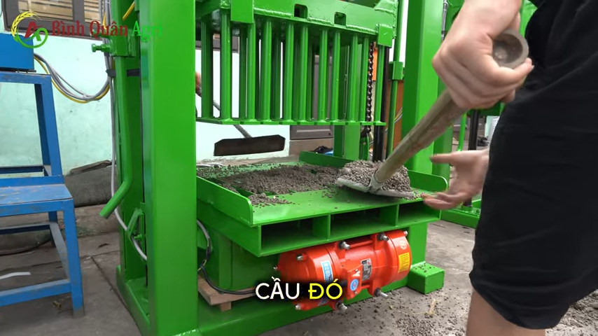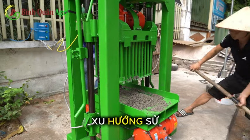 Điểm đặc biệt của dòng máy này chính là công nghệ đầm rung hai chiều, vừa ép vừa rung liên tục. Cơ chế này giúp các hạt vật liệu liên kết chặt chẽ hơn, tạo ra những viên gạch chắc chắn, bền và ít bị nứt vỡ trong quá trình phơi khô. Để sản xuất gạch, bà con chỉ cần chuẩn bị hỗn hợp nguyên liệu gồm đá mạt, cát, xi măng và nước, trộn đều theo tỷ lệ phù hợp rồi đưa vào khuôn. Sau khi khởi động máy, quá trình ép và tạo hình sẽ diễn ra nhanh chóng chỉ trong vài giây. Gạch thành phẩm được đưa ra ngoài với bề mặt gọn gàng, sắc nét và có thể phơi khô tự nhiên mà không cần nung.