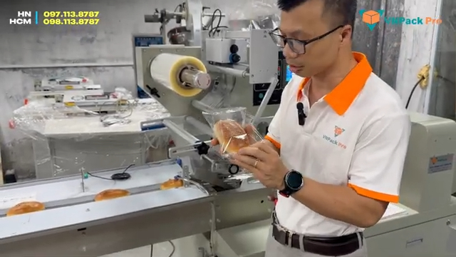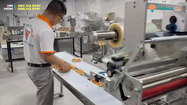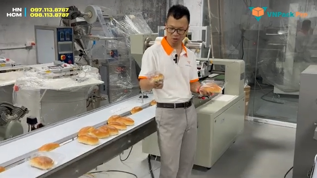 Sau khi hoàn thành, thành phẩm sẽ đi ra ở đầu máy. Các bạn có thể thấy bao bì được bơm căng rất đẹp, đường hàn chắc chắn và thẩm mỹ. Vị trí in ngày sản xuất và hạn sử dụng cũng được in rõ ràng trên bao bì. Nếu quý vị và các bạn đang có nhu cầu đầu tư máy đóng gói bánh mì hoặc đóng gói các loại sản phẩm khác, hãy liên hệ với VNFAFRO. Chúng tôi có showroom trưng bày và chạy thử máy tại Hà Nội và TP. Hồ Chí Minh để khách hàng có thể trực tiếp đến tham khảo và trải nghiệm thiết bị. Đồng thời đội ngũ kỹ thuật của chúng tôi sẽ tư vấn giải pháp đóng gói phù hợp và hiệu quả nhất cho từng nhu cầu sản xuất.