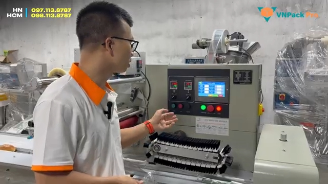 Thứ ba, trên bao bì chúng ta có thể in ngày sản xuất và hạn sử dụng trực tiếp trong quá trình đóng gói. Máy được trang bị bộ phận in date giúp in thông tin lên bao bì chính xác theo vị trí đã thiết kế trên màng in. Về vật liệu bao bì, máy có thể sử dụng nhiều loại màng đóng gói phổ biến như màng OPP hoặc màng ghép có lớp tráng bạc bên trong. Bao bì có thể là màng trong suốt hoặc màng in màu sẵn. Dù là loại nào thì máy cũng có thể đóng gói tốt, đồng thời hệ thống cảm biến sẽ đảm bảo vị trí in date luôn nằm đúng trên phần thiết kế của bao bì.