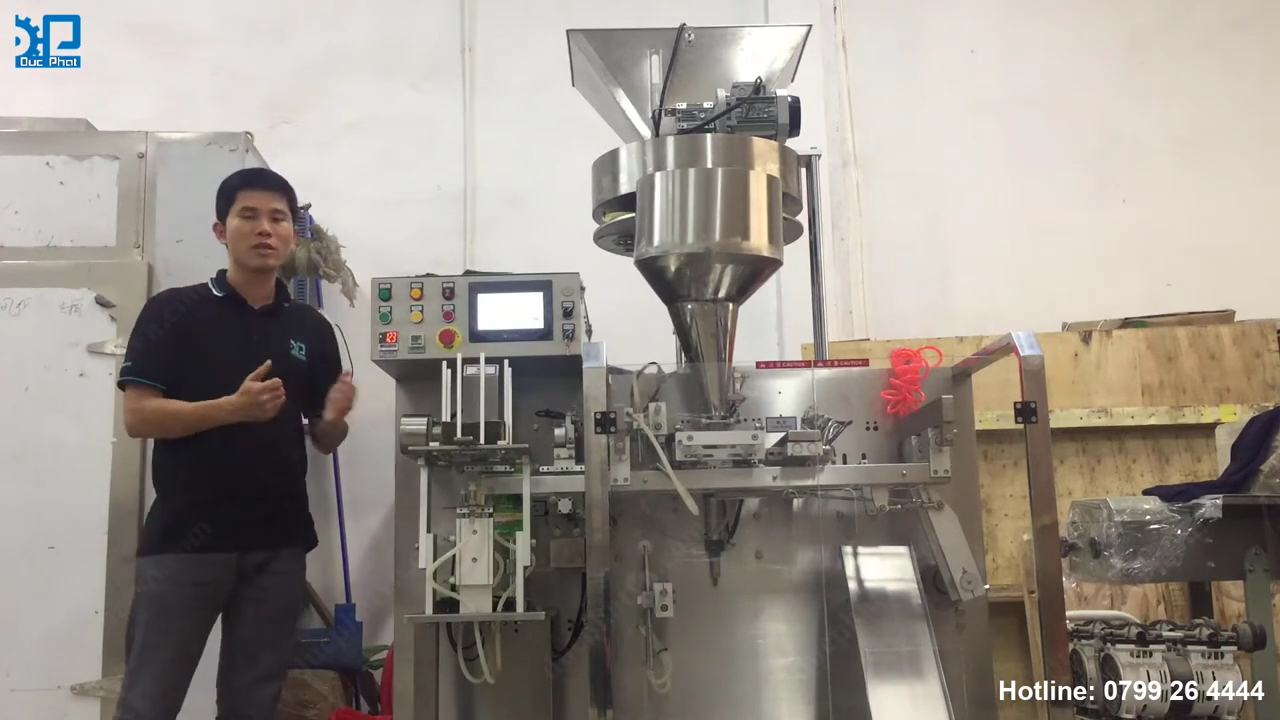 Xin chào các bạn, hôm nay mình xin giới thiệu đến các bạn một dòng máy mới của công ty, đó là Máy đóng gói túi sẵn dạng nằm ngang. Đây là dòng máy chuyên dùng để đóng gói các sản phẩm vào túi đã được tạo sẵn, phù hợp với nhiều loại thực phẩm hoặc hàng hóa cần đóng gói tự động. Trước tiên chúng ta cùng tìm hiểu tổng thể cấu tạo của máy. Hình thức định lượng của máy sử dụng cơ cấu định lượng bằng cốc đong. Cơ cấu này gồm phễu chứa nguyên liệu và hệ thống mâm chia định lượng. Nguyên liệu sẽ được đưa vào phễu, sau đó các cốc định lượng sẽ chia đều lượng nguyên liệu trước khi đổ vào túi.