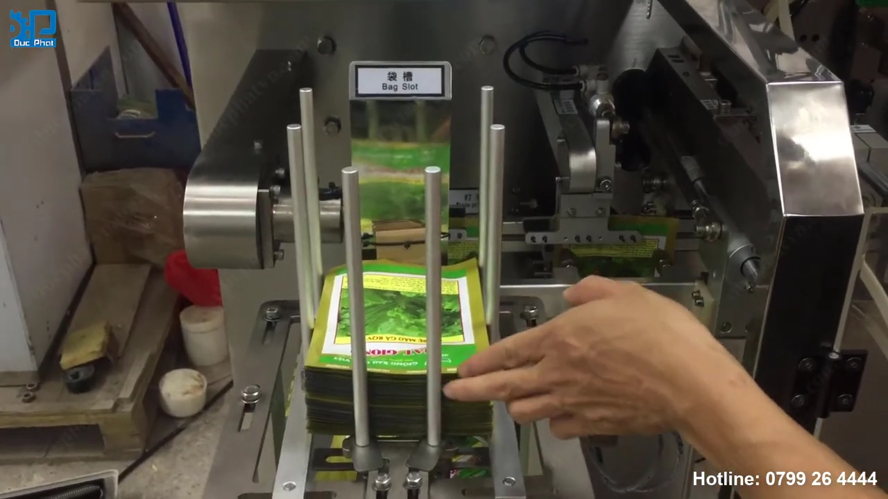 Tiếp theo chúng ta đi vào từng bộ phận cụ thể của máy. Đây là bộ phận chứa và cấp túi. Các túi bao bì được sắp xếp thành từng chồng ngay ngắn trên khay cấp túi. Sau khi túi được đặt vào khay, máy sẽ tự động đưa túi vào cơ cấu gắp túi. Cơ cấu gắp túi sẽ gắp từng túi một và đưa qua các trạm xử lý tiếp theo. Trạm đầu tiên là trạm hàn hoặc in ngày sản xuất, hạn sử dụng và số lô sản phẩm nếu bao bì có yêu cầu. Sau đó túi sẽ được chuyển sang trạm mở túi, nơi cơ cấu hút chân không hoặc cơ cấu cơ khí sẽ mở miệng túi ra để chuẩn bị cho quá trình cấp liệu.