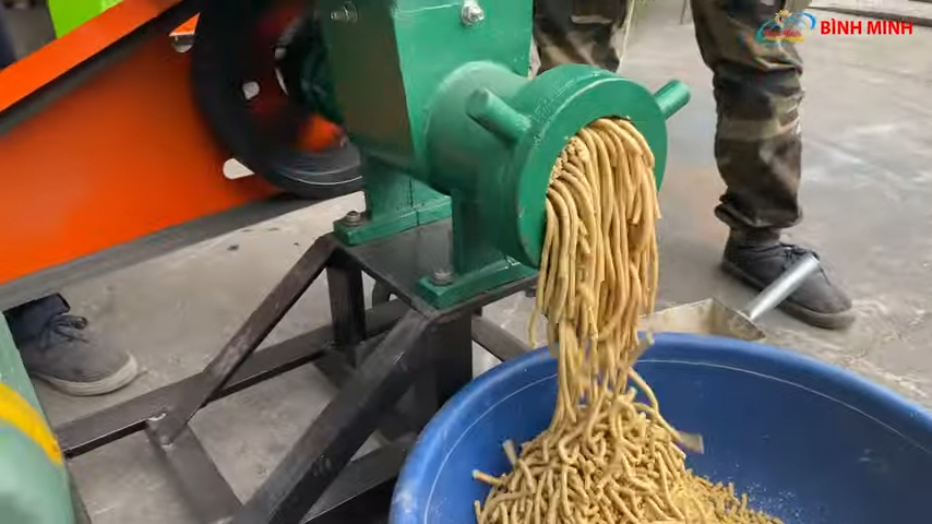 Bên trong máy là hệ thống trục xoắn lớn và khỏe, hoạt động với tốc độ cao giúp cuốn nguyên liệu và tạo lực ép mạnh trong quá trình vận hành. Khi nguyên liệu được đưa vào máy, trục xoắn sẽ nghiền và ép chúng theo ống đùn, sau đó đẩy qua mặt sàng để tạo ra thành phẩm nhuyễn mịn, phù hợp để làm thức ăn cho nhiều loại vật nuôi.