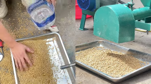 Trong khoảng 2-3 phút, các viên cám nổi sẽ bắt đầu hình thành và bà con chỉ cần tiếp tục cho nguyên liệu vào đều tay. Đảm bảo rằng cám ra khỏi máy sẽ đều và đẹp mắt. Quá trình này cũng giúp các viên cám nổi tròn đều, đảm bảo chất lượng và dễ hấp thụ cho vật nuôi.